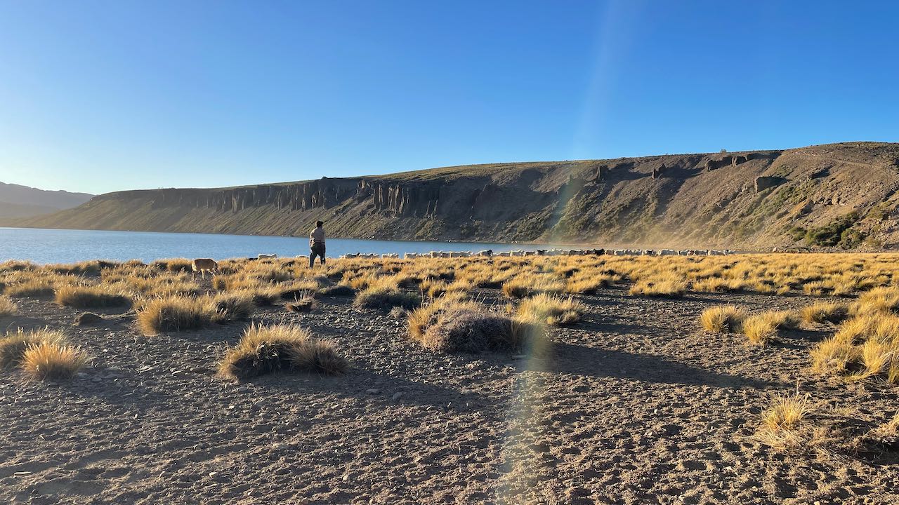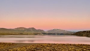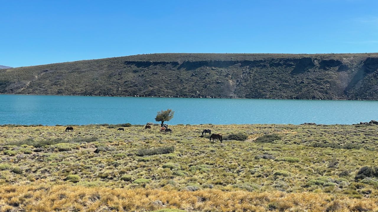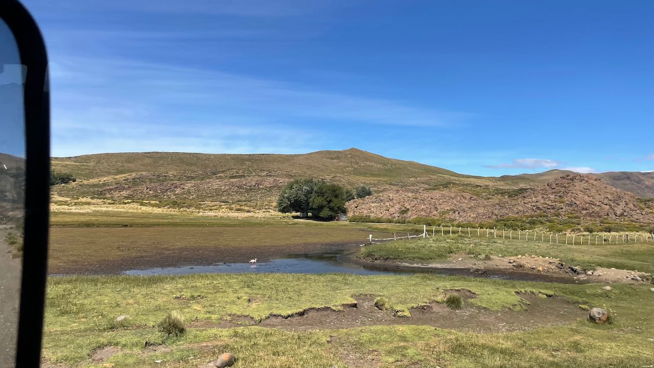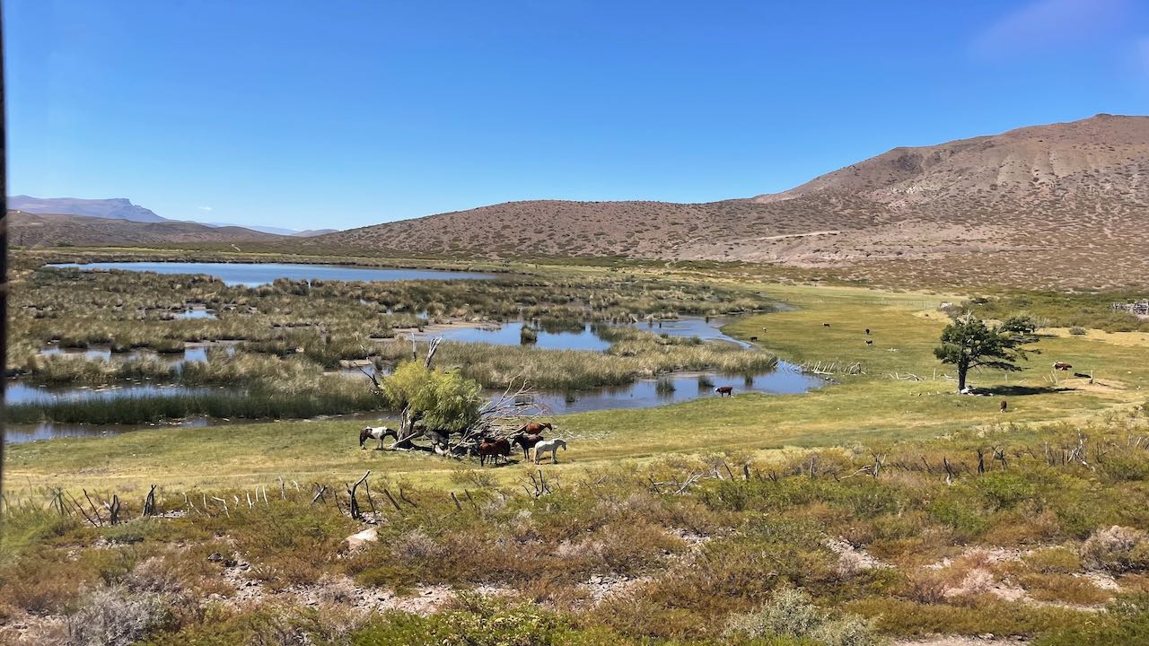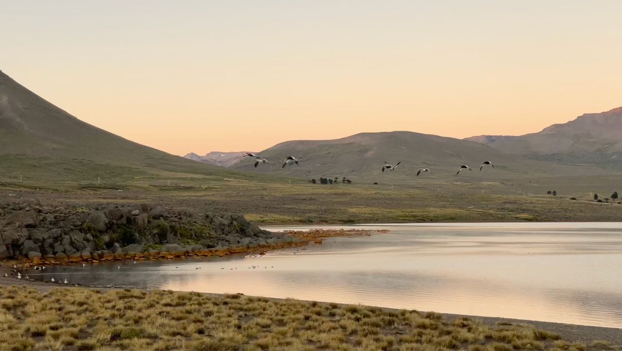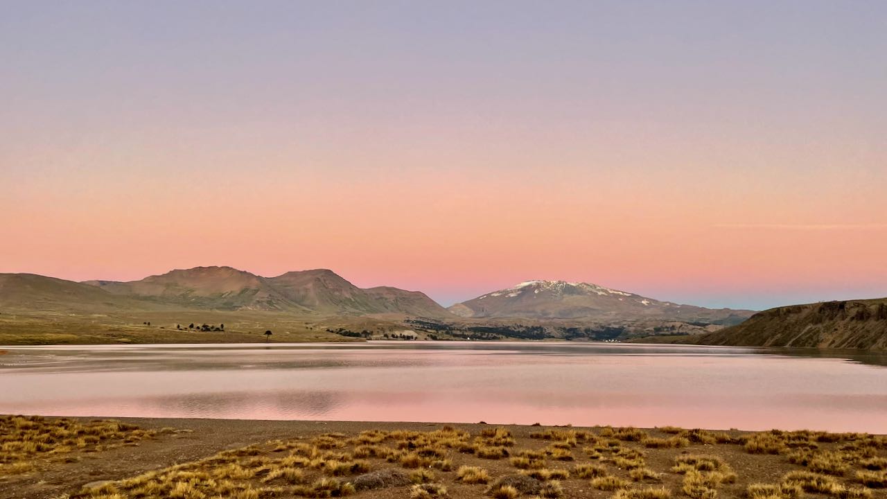 Vor uns ein rosa See, idyllisch verschlängelte Wasserläufe, die Laguna Auquinco mit Strand….