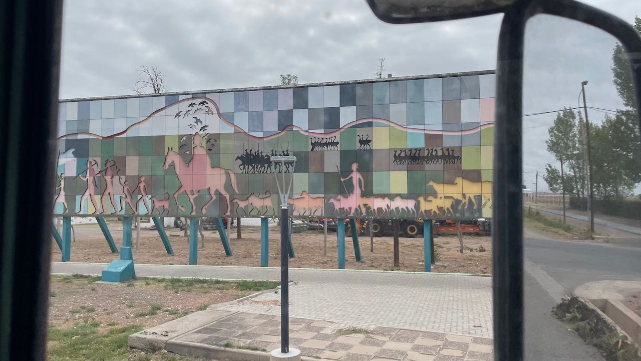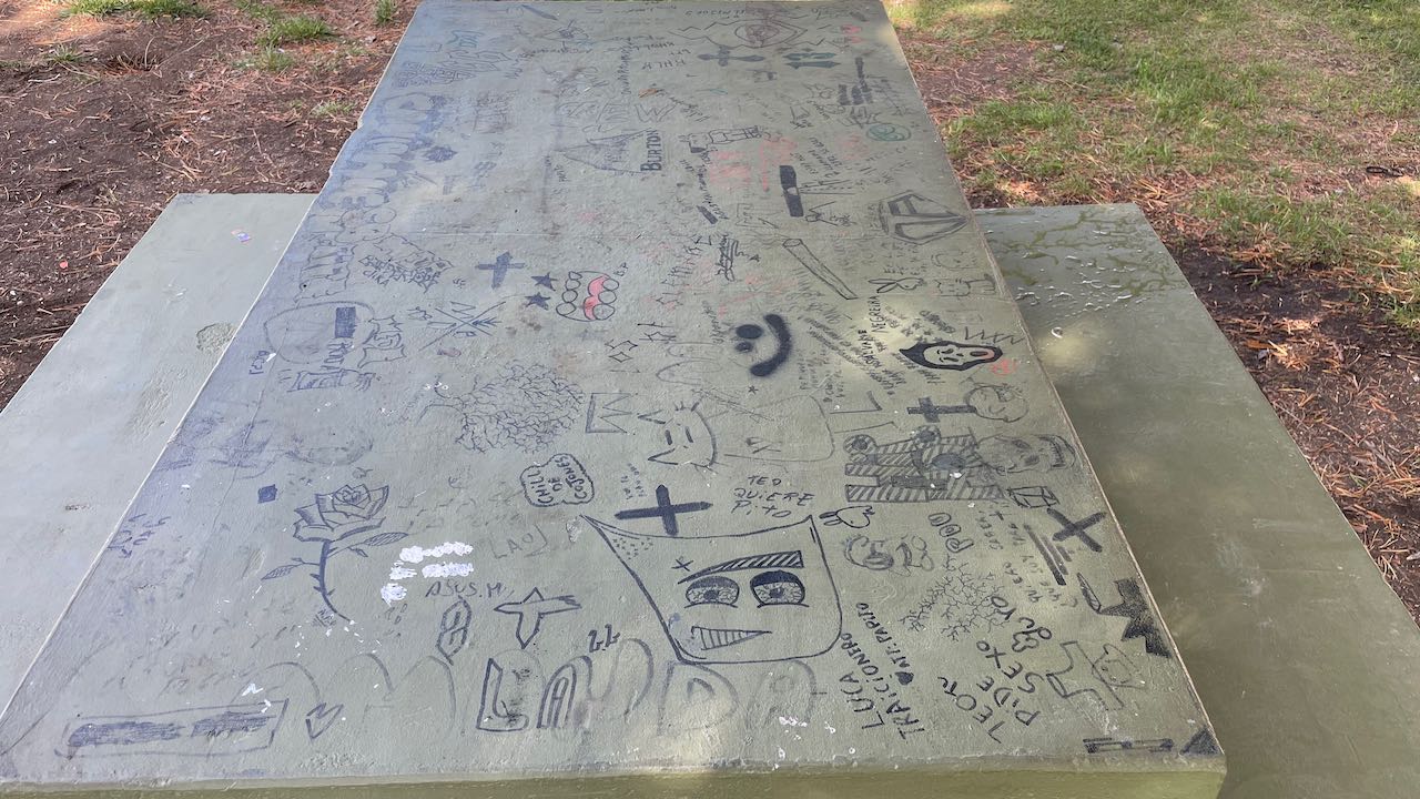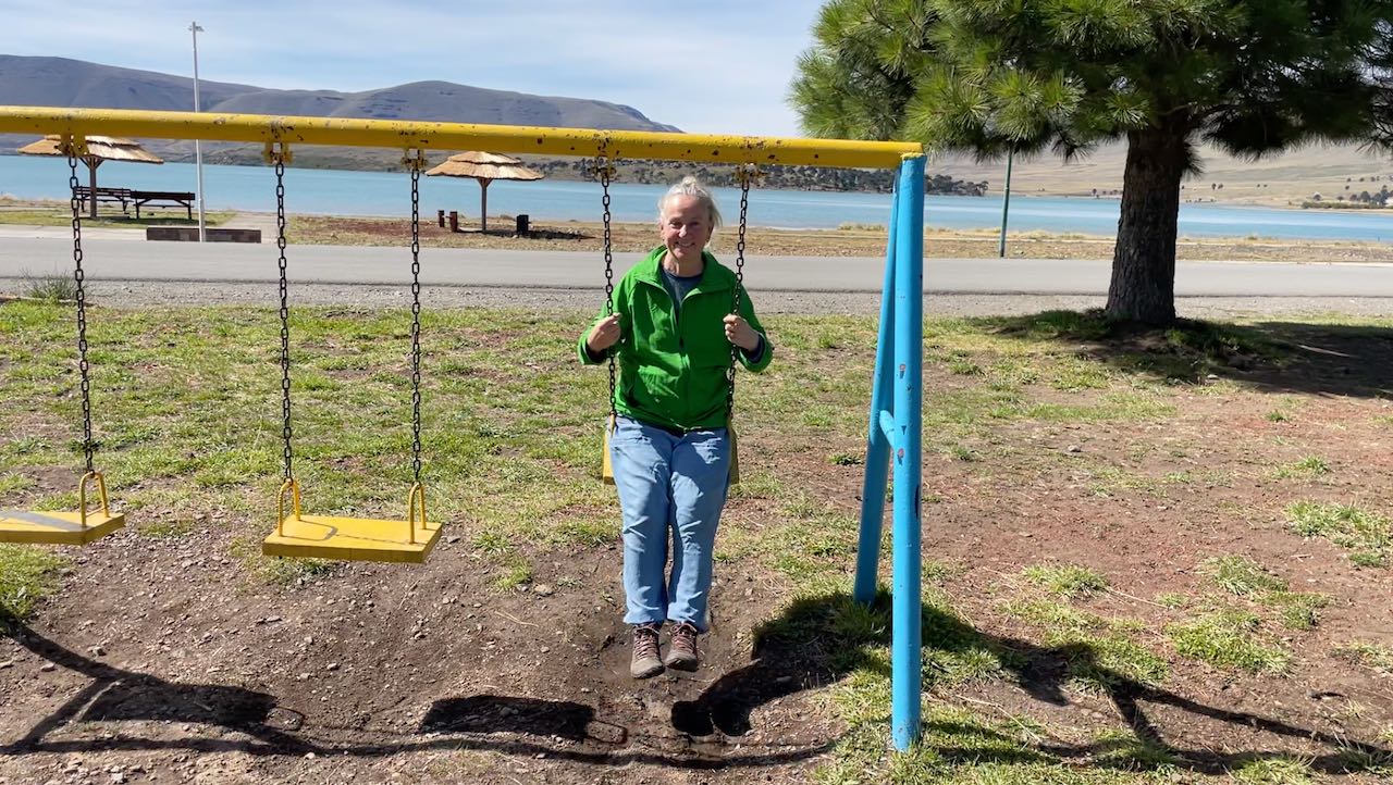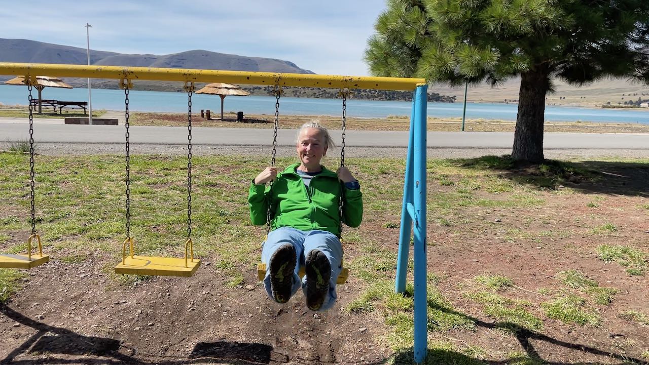 Wir tanken Wasser nach, bewundern die Kunst auf dem Picknicktisch und testen die Schaukeln.
