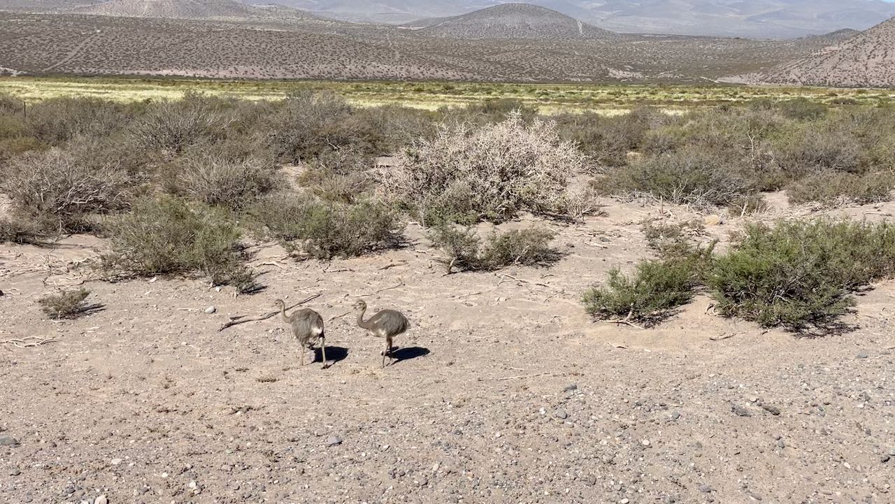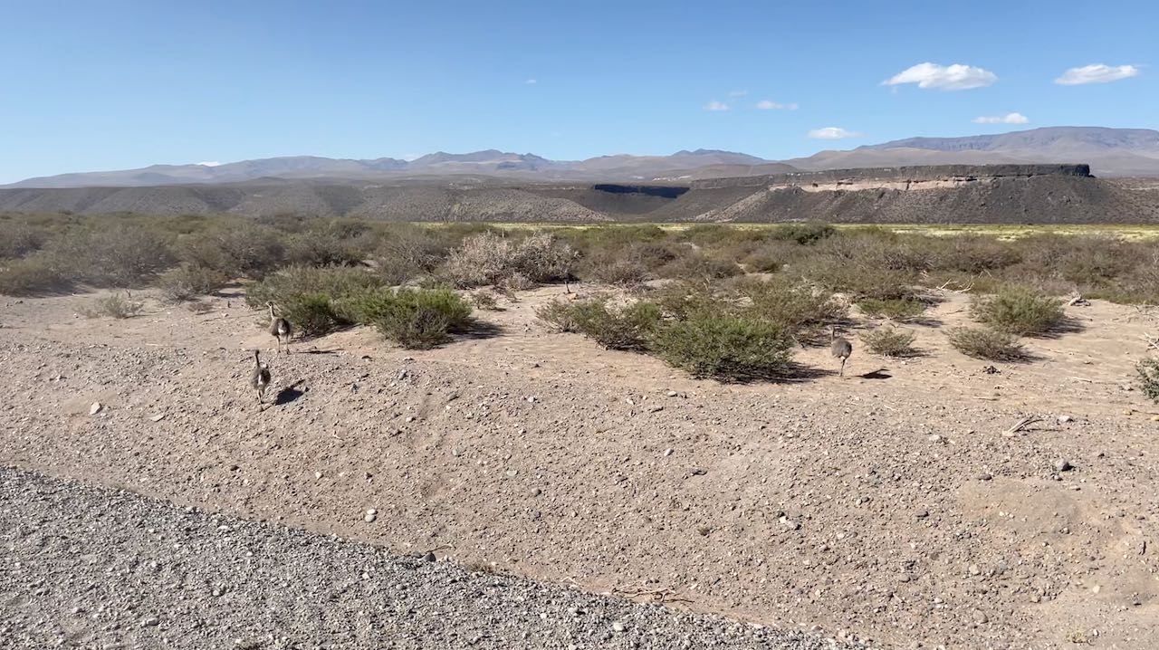 Drei Nandu-Teenager am Strassenrand, die nicht sofort in Panik davonstürmen, sondern sich ruhig fotografieren lassen. Sehr selten.