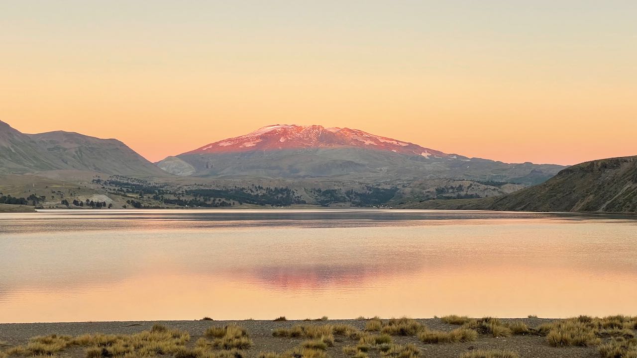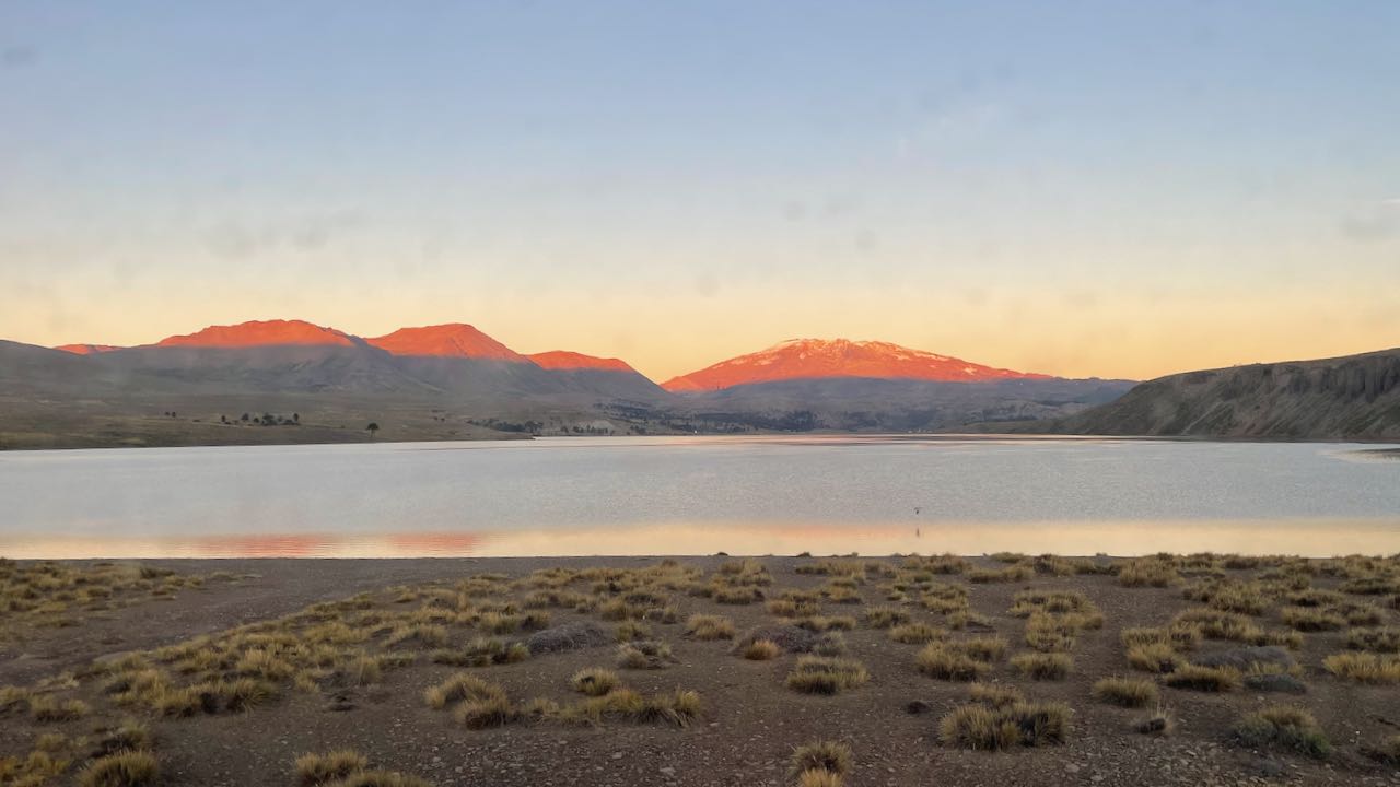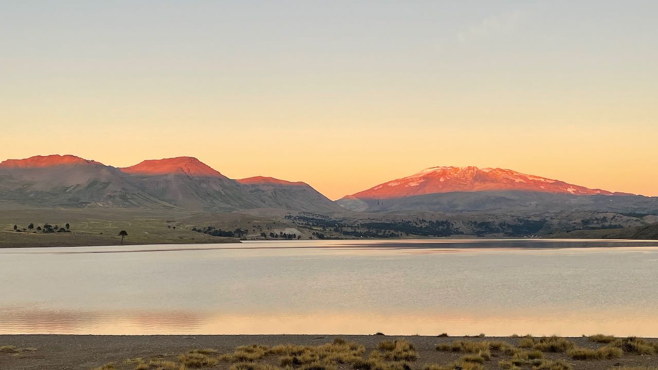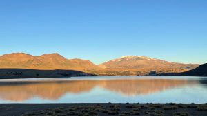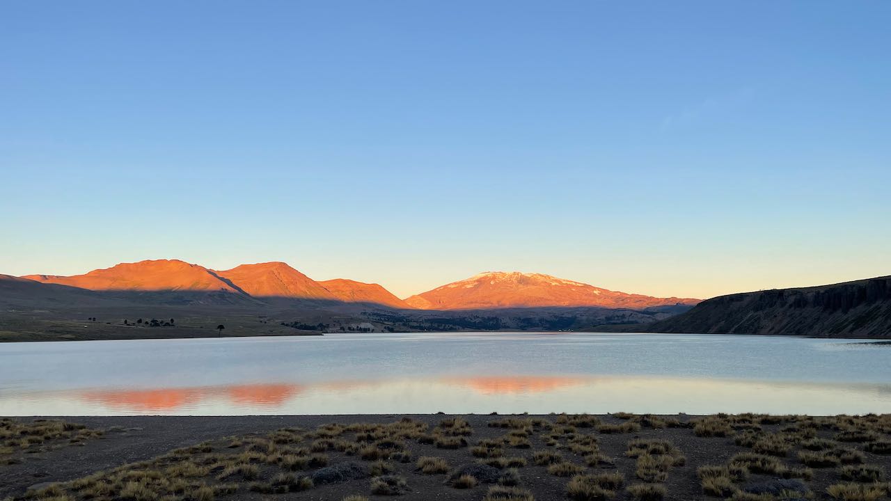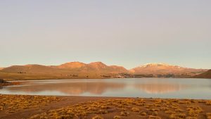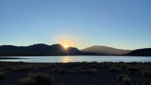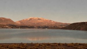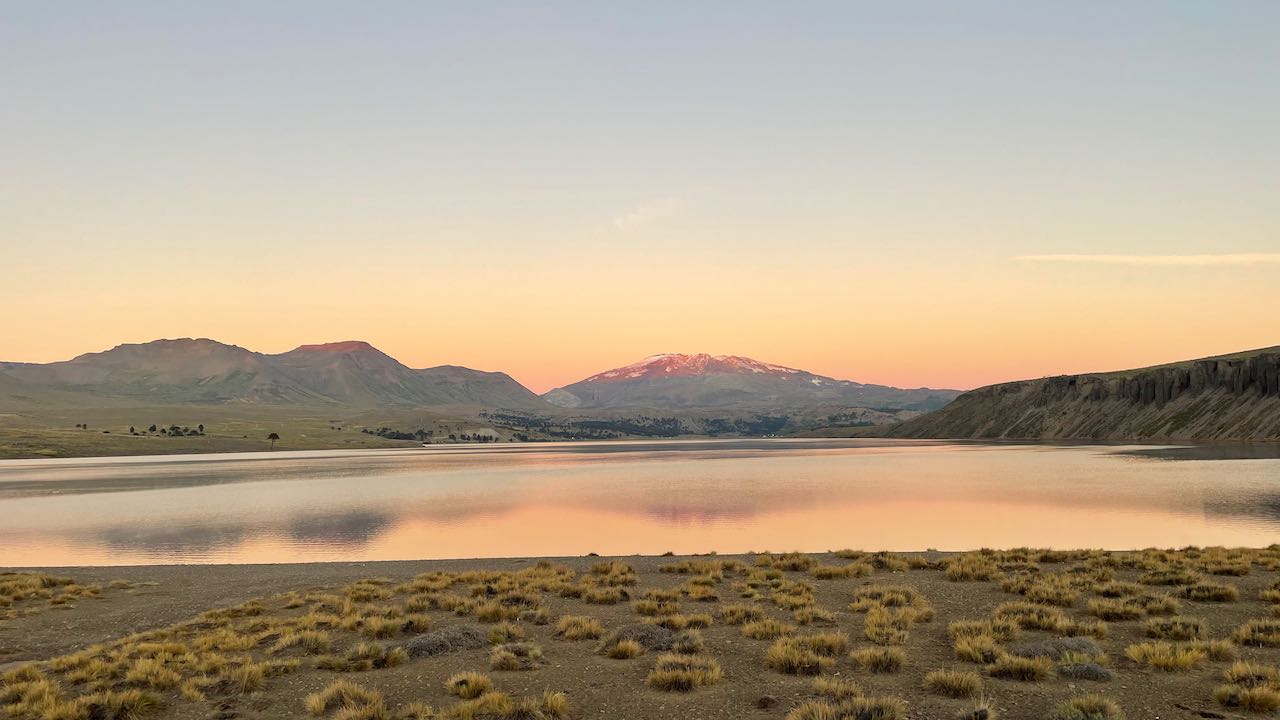 Viertel nach sieben Uhr, Dämmerung am Lago Caviahue, am gegenüberliegenden Ufer flimmern die Strassenlaternen.