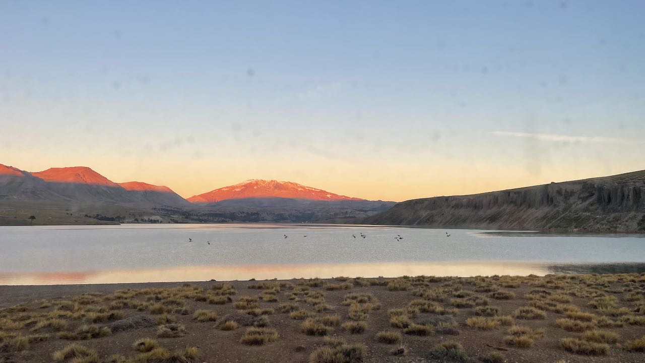 Während sich die Bergspitzen langsam färben, verlassen Wildgänse ihre Übernachtungsplätze und beginnen den Tag