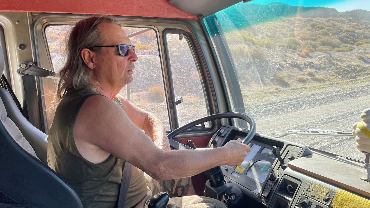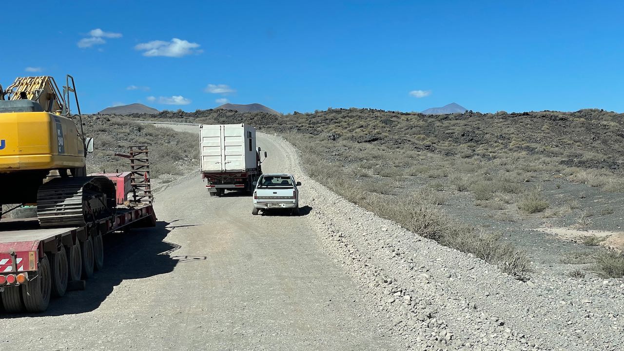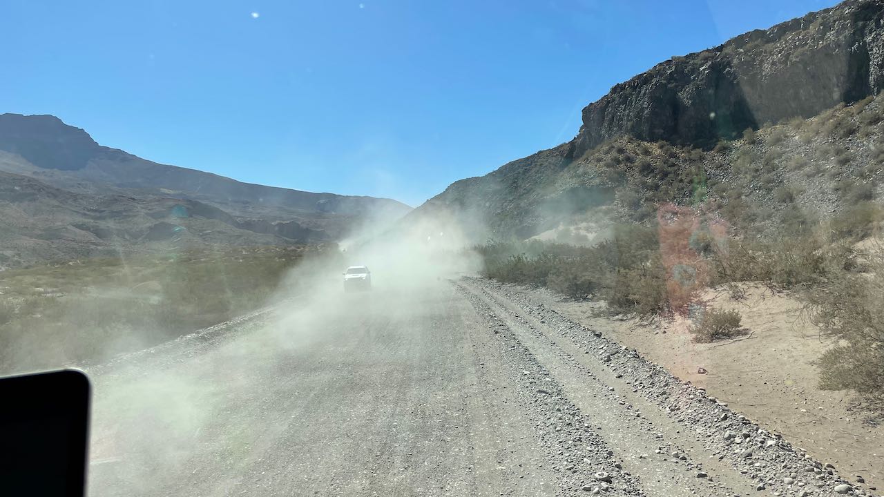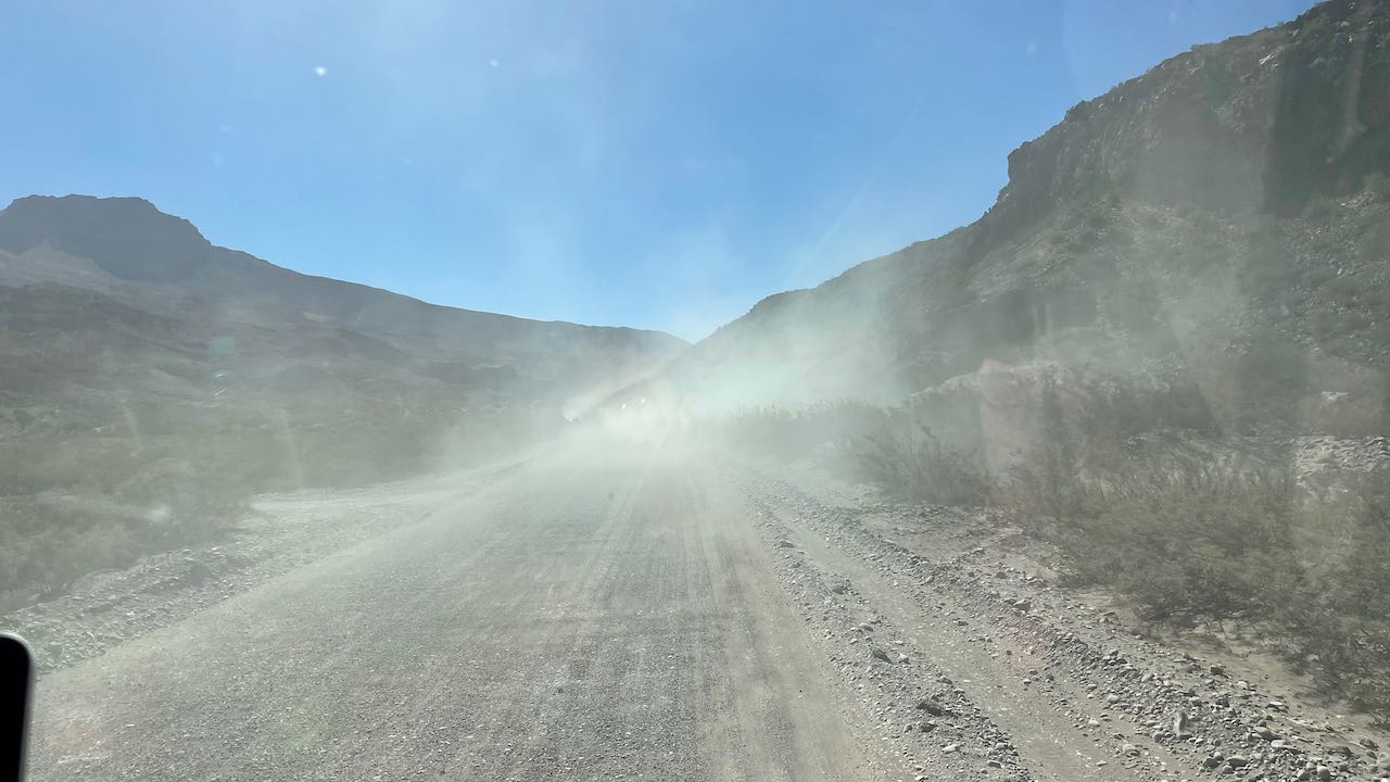 Der Planierer kommt uns entgegen, Gegenverkehr hüllt uns in Staubwolken, hust….