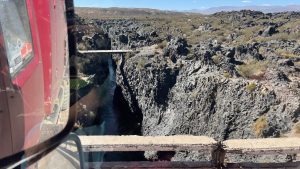 Über eine bröselige Brücke überqueren wir eine tiefe, enge Schlucht