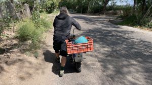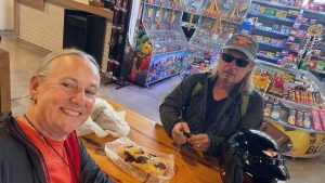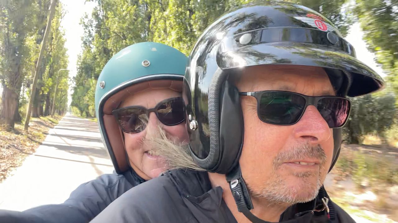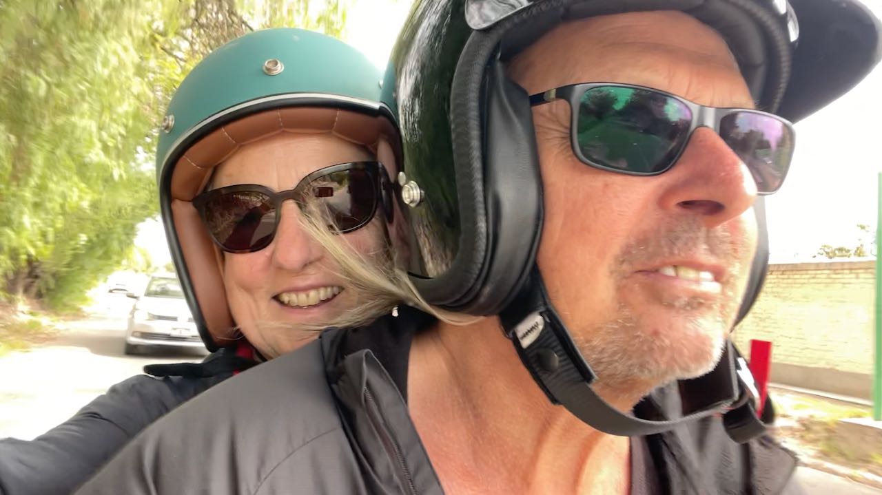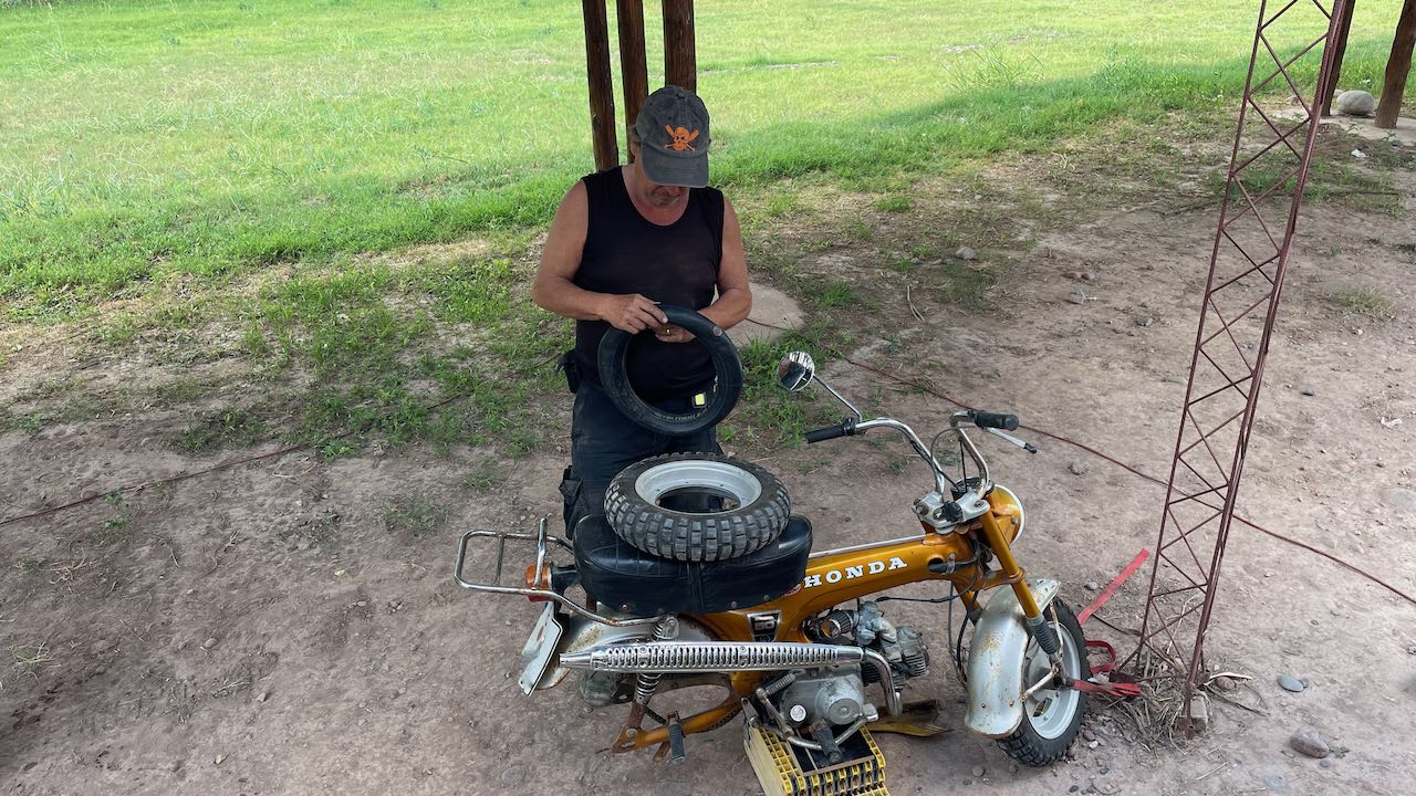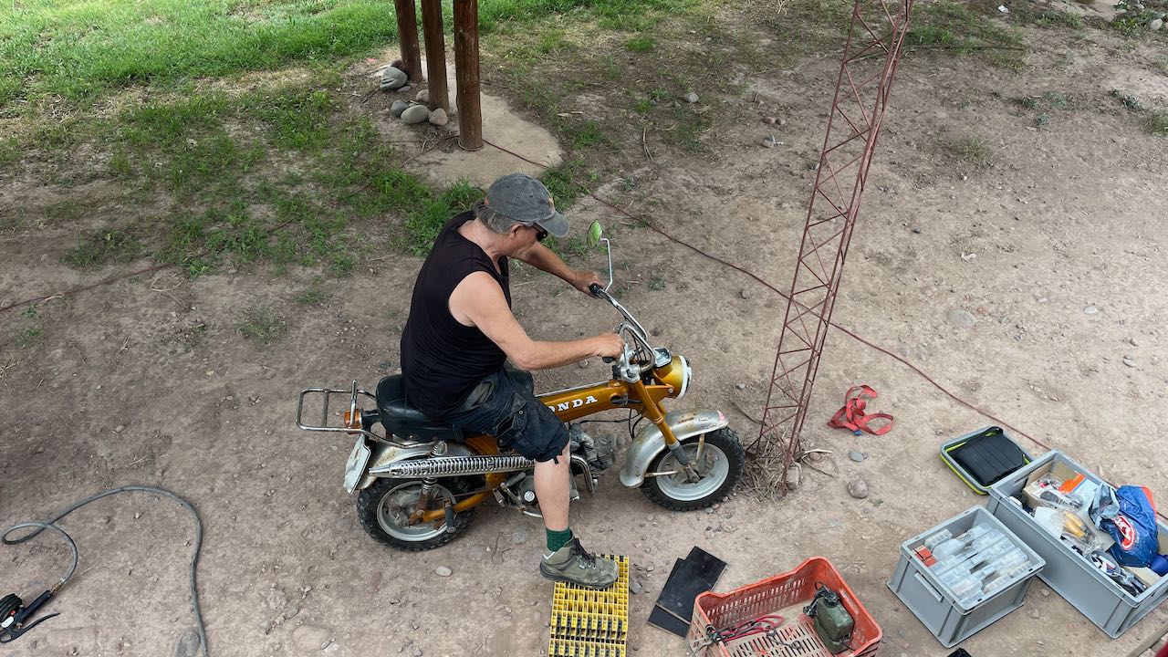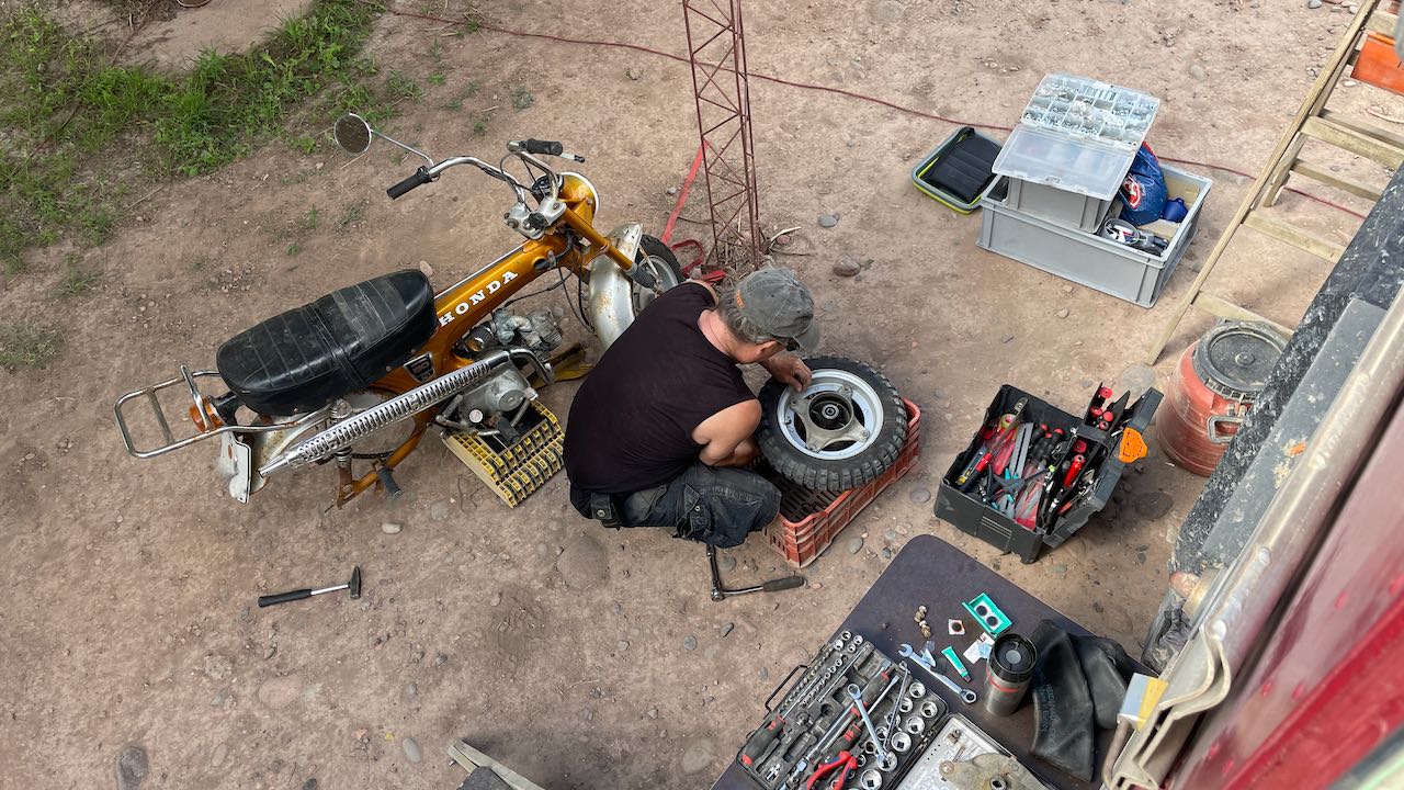 Martin lädt die Honda Dax aus und gibt ihr eine Pflegeeinheit. Auf der sauberen Maschine sausen wir los um einzukaufen.