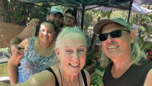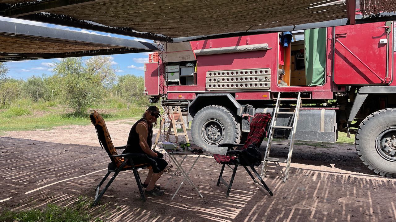 Erstmal einrichten und etwas essen, unterm Schattendach, es ist sehr heiß.