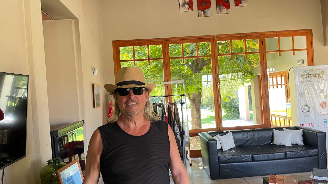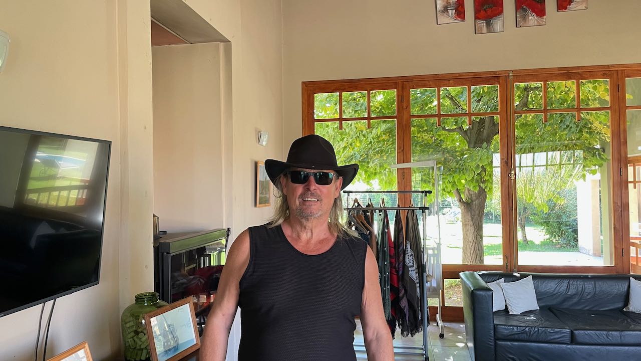 Martin probiert ein paar Hüte, die in der Posada verkauft werden.