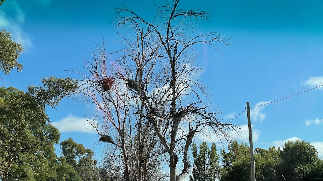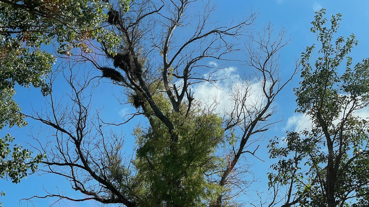 In die Bäume sind große Vogelnester eingewoben, ich wüßte gerne, welche Vögel solche Riesennester bauen.