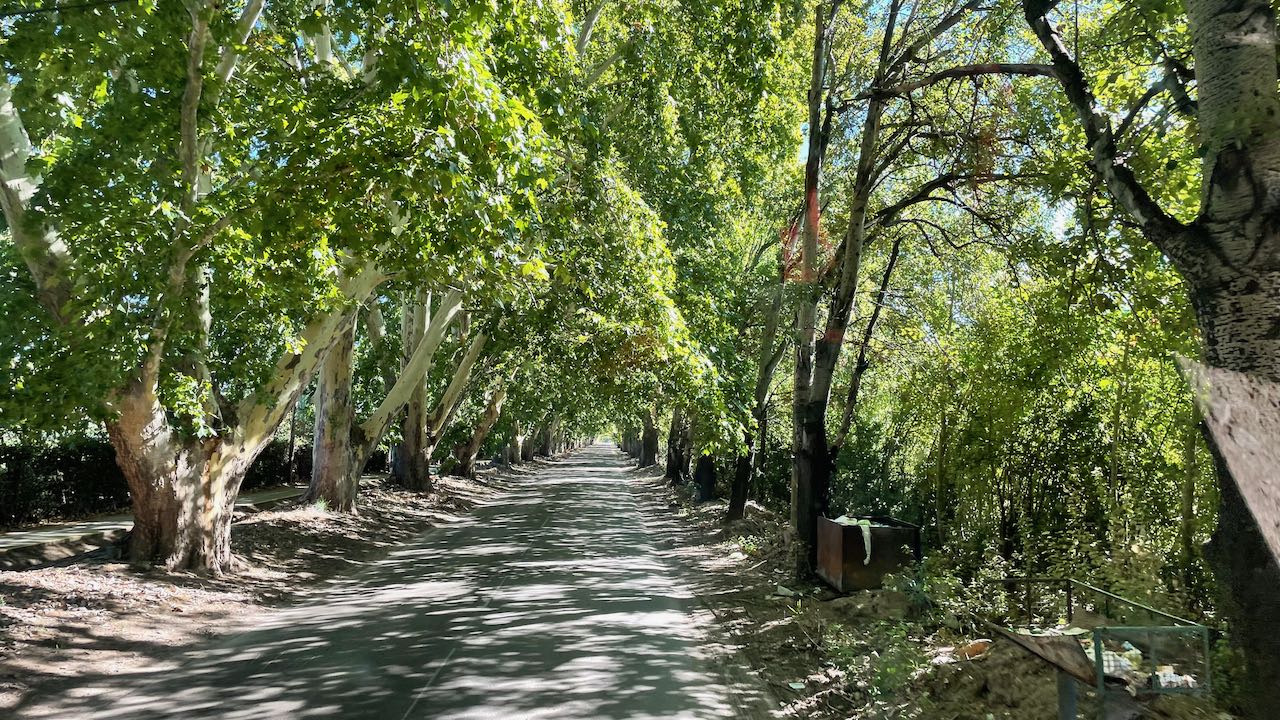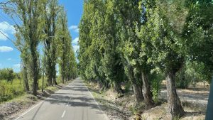 Froh, dem zu entkommen, biegen wir ab und gleiten ruhig durch eine Pappelallee, links und rechts stehen Olivenbäume