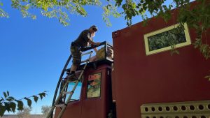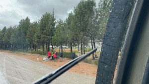 Im strömenden Regen versucht Martin, das nasse Feuerholz auf dem Dach zu verstauen,