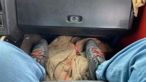 aber irgendwie will es nicht sicher halten. Der Sack landet schließlich im Beifahrerfußraum. Nicht so bequem, aber das geht schon.
