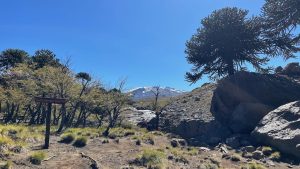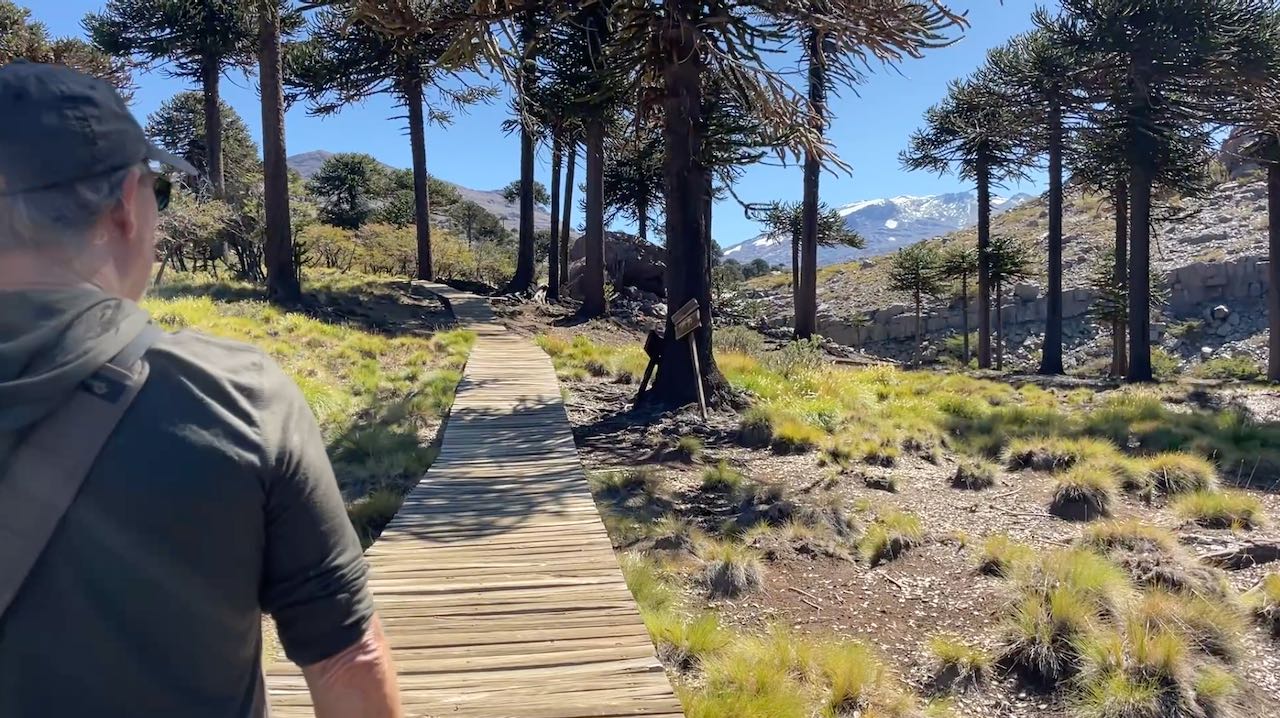 Es geht über einen Steg, zwischen den Bäumen schimmert die Schneekuppe des Volcano Copahue.