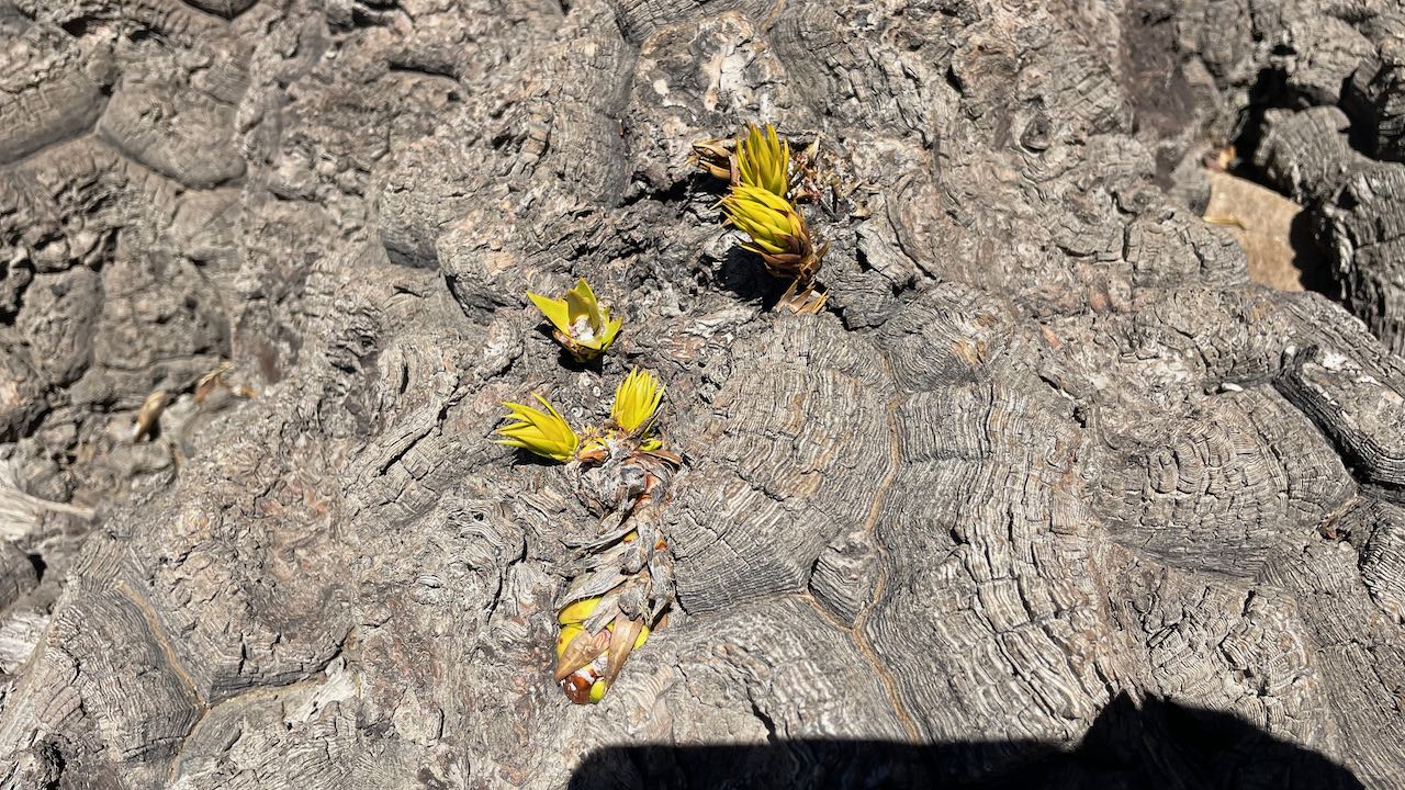 Sprößlinge treiben aus den Wurzeln, quellen zwischen der Rinde hervor. Die Blätter spitz und scharfkantig wie Messer.