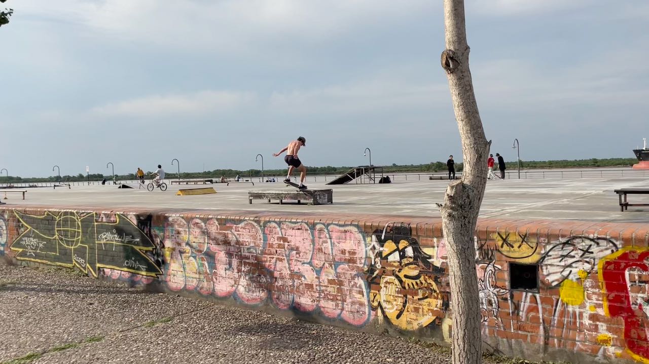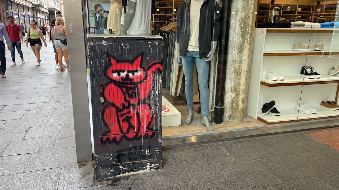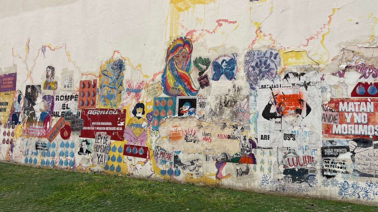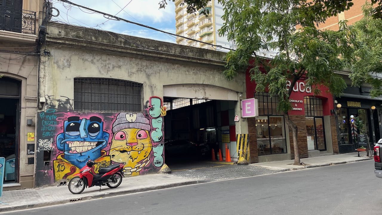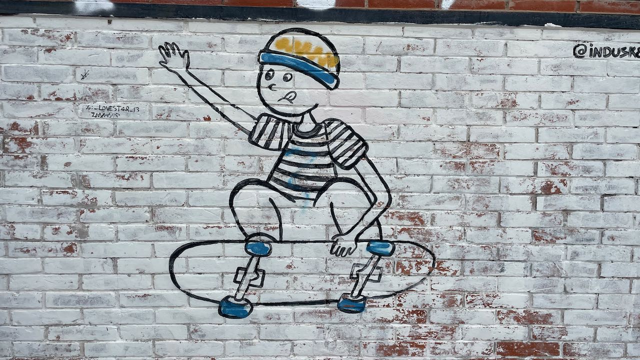 Murals an den Wänden, an einen kleinen Park schließt sich die Einkaufsstrasse an.