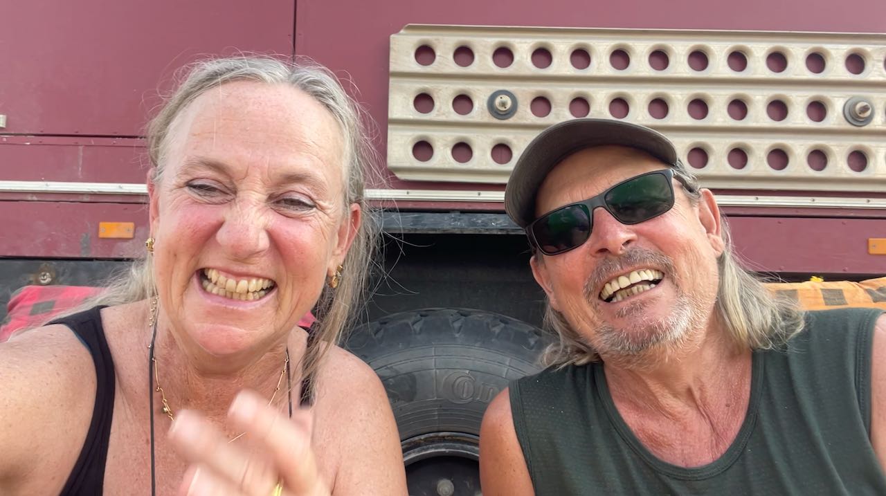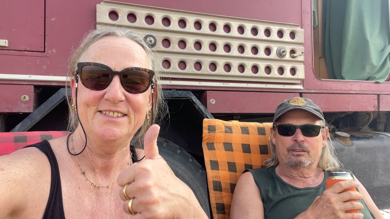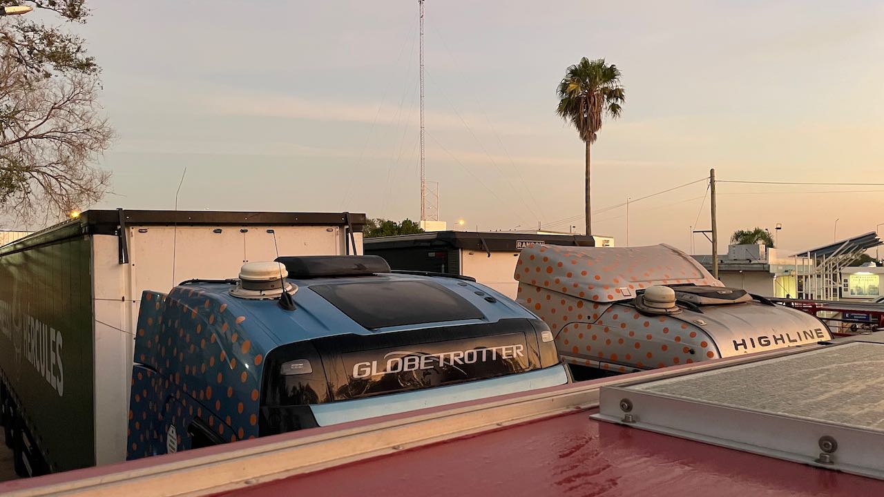 Guten Morgen! Umzingelt von LKWs wachen wir auf.