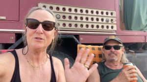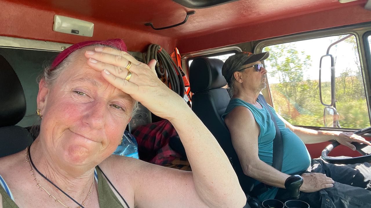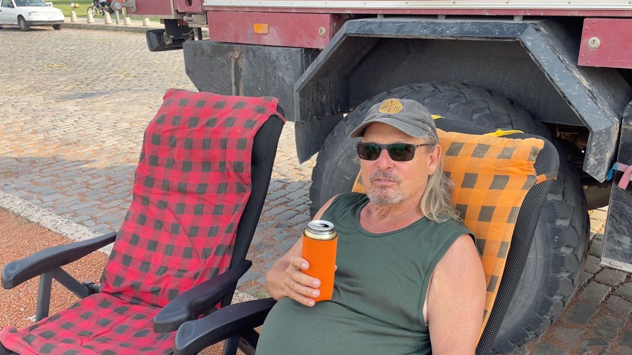 Trinken unser Schneider Bier, die anderen LKW-Fahrer grüßen rüber.