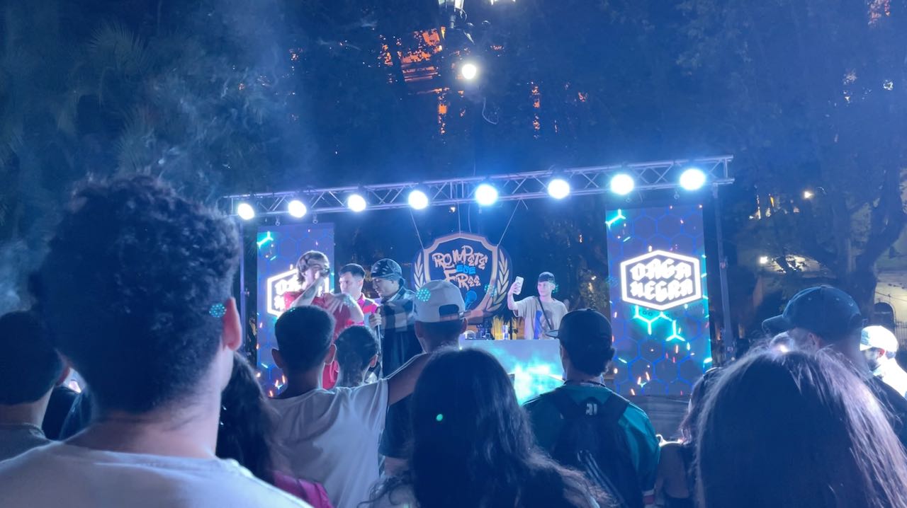 Auf der ersten Bühne stapfen ein paar betont coole Rap-Bubies herum. Die Statuen sehen auch so aus, als halten sie ein Mikro und rappen mit.