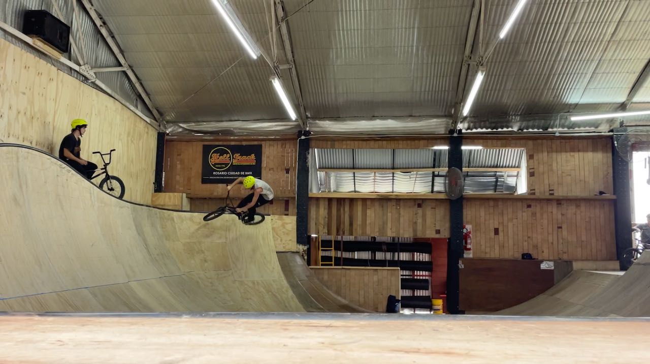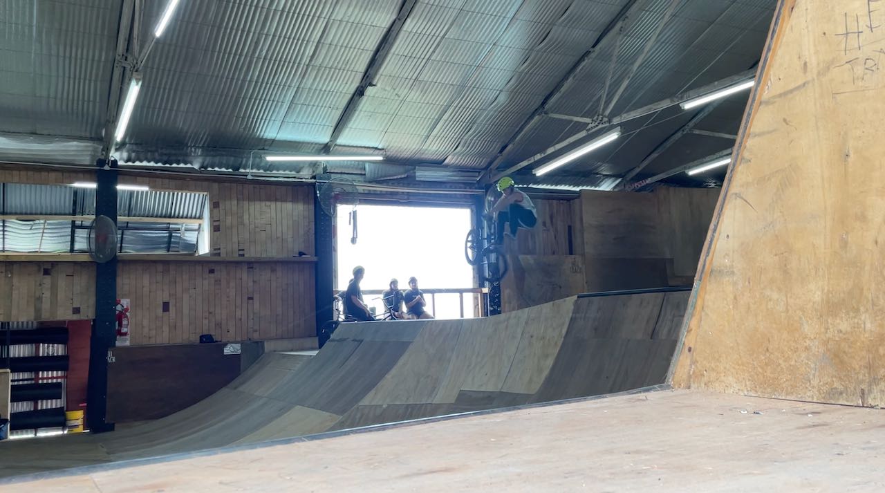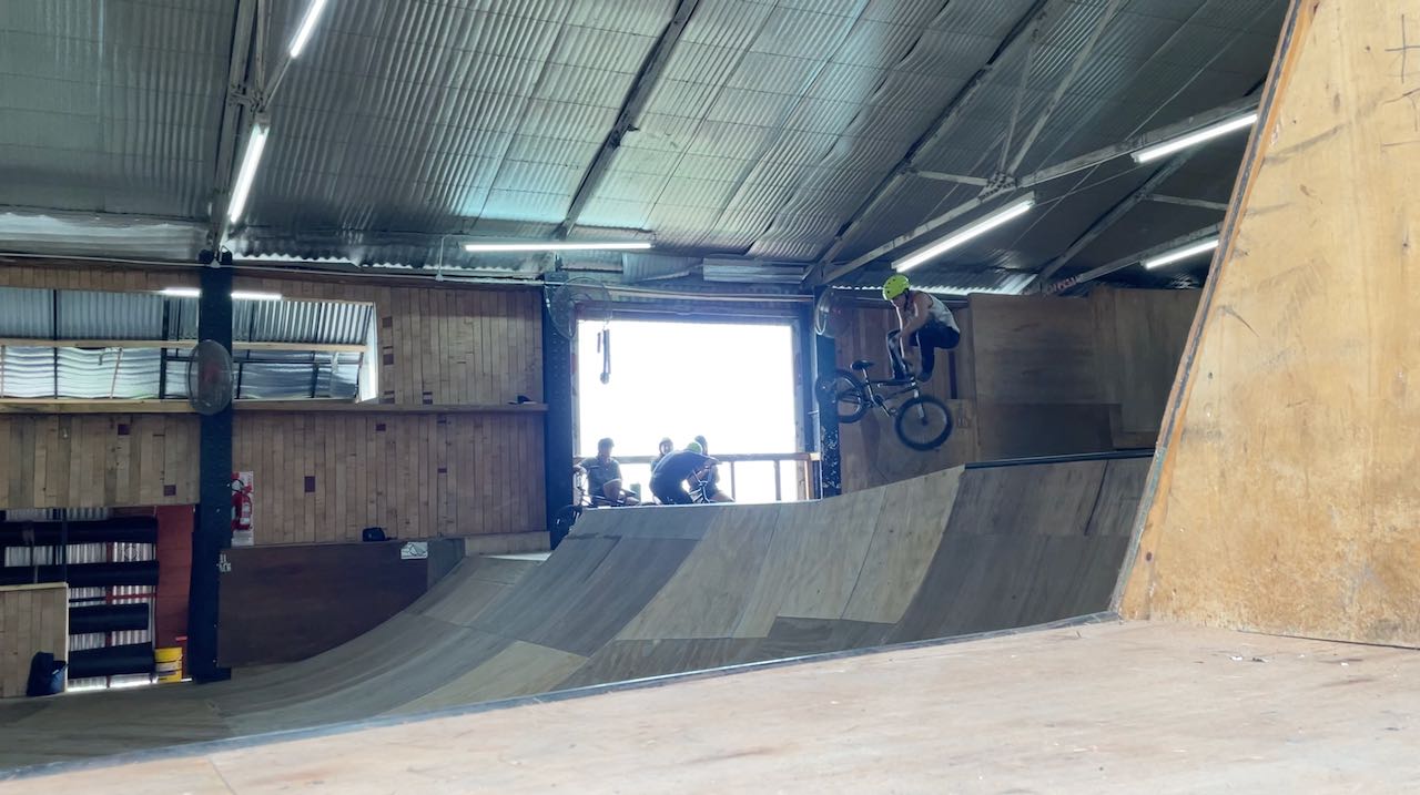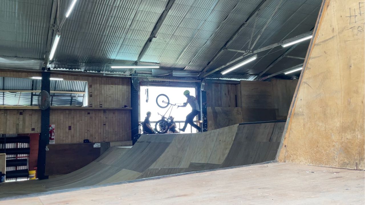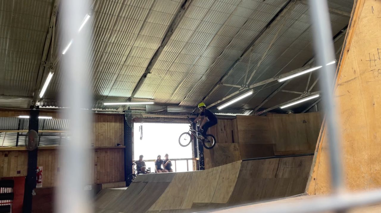 Durch ein Fenster schauen wir den waghalsigen BMX-Radkünstlern zu.