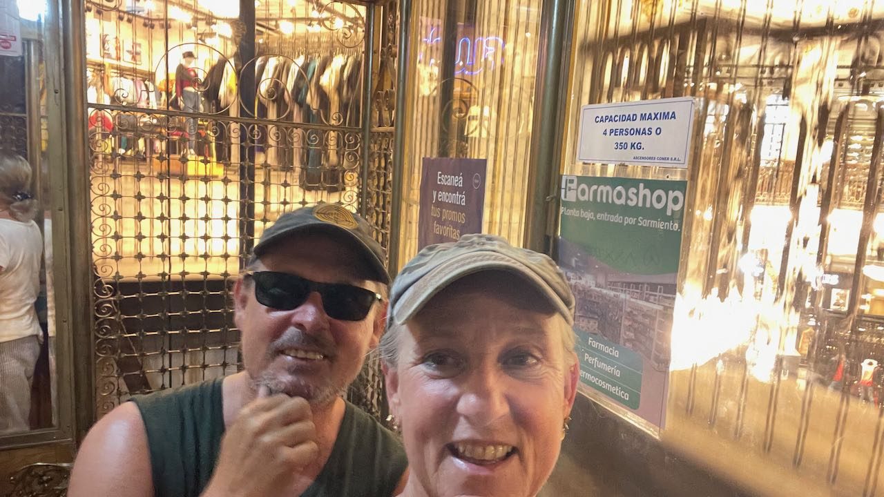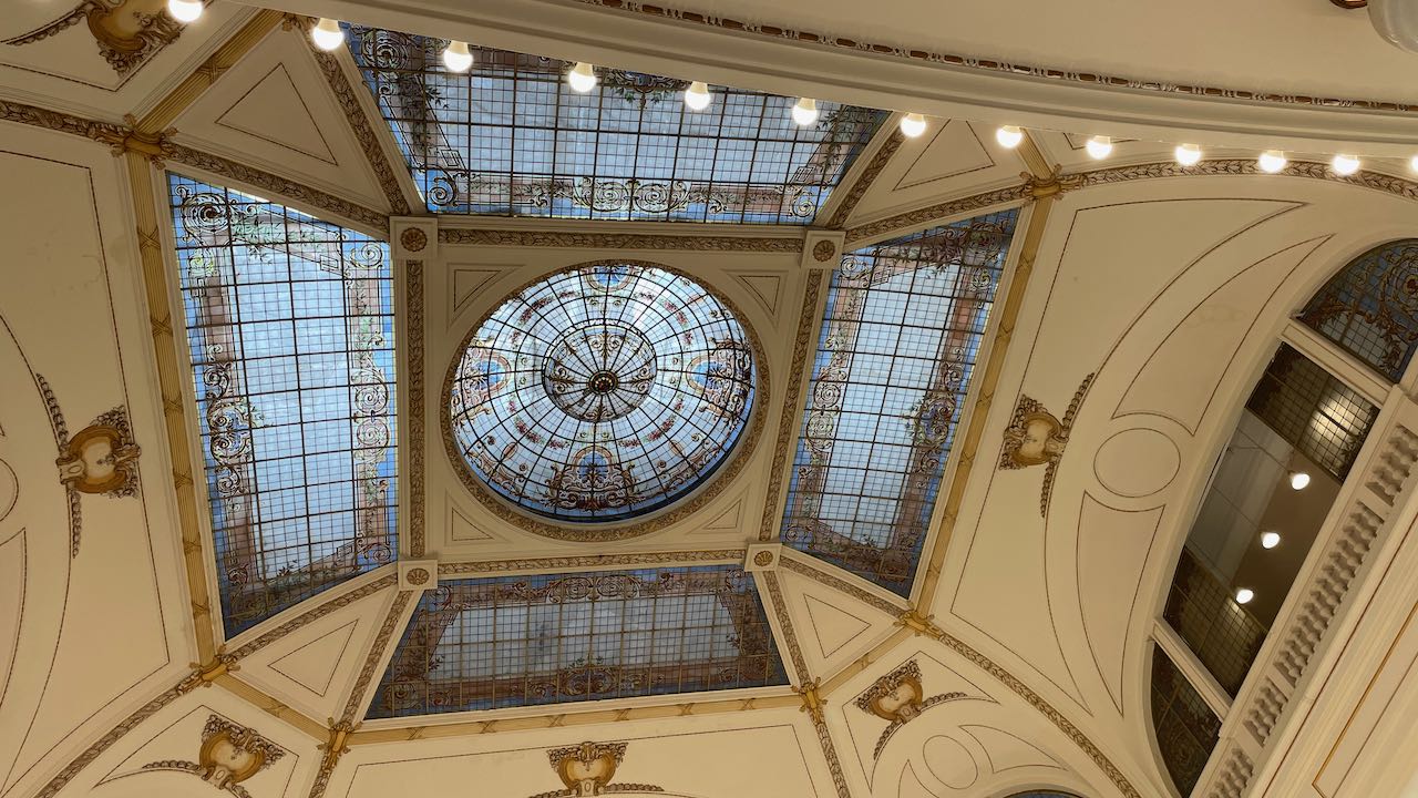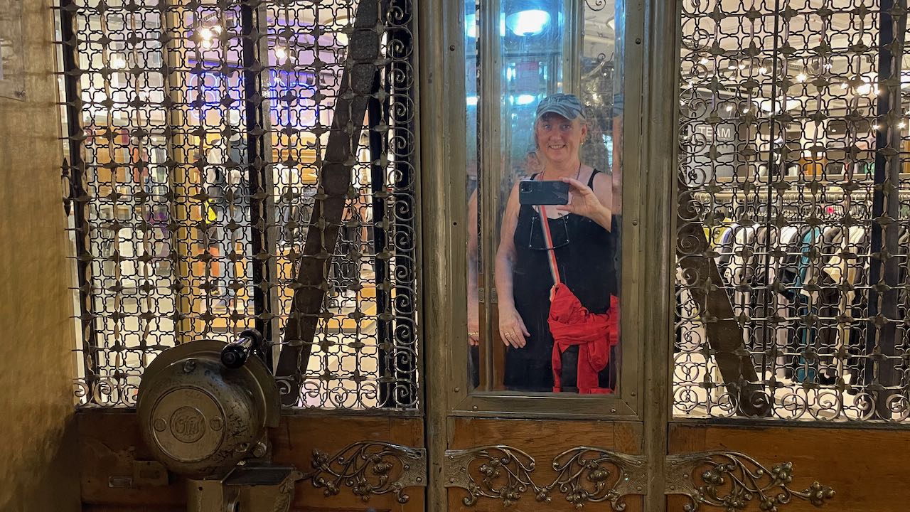 Der Originalaufzug – leider ohne Liftboy – bringt uns hinauf unter die Glaskuppel