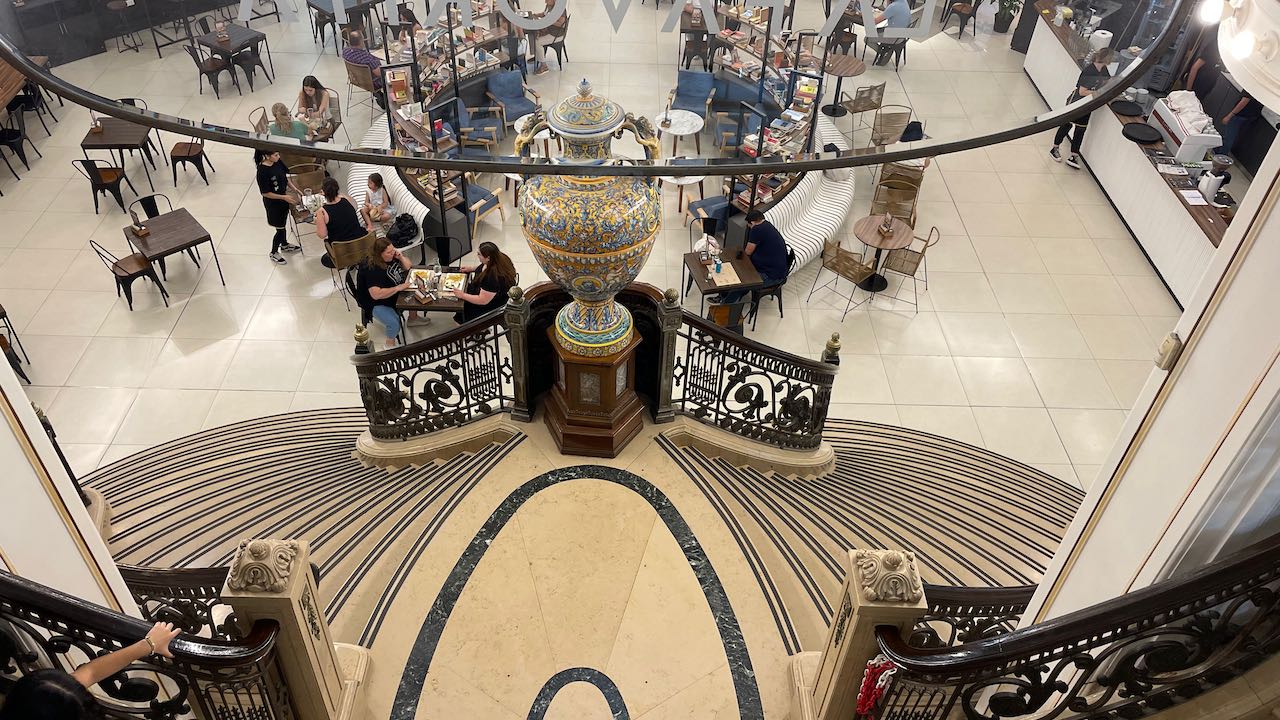 Über die Treppe schreiten wir hinab, ein wunderschönes Haus. Wie trostlos sehen moderne Kaufhäuser dagegen aus.