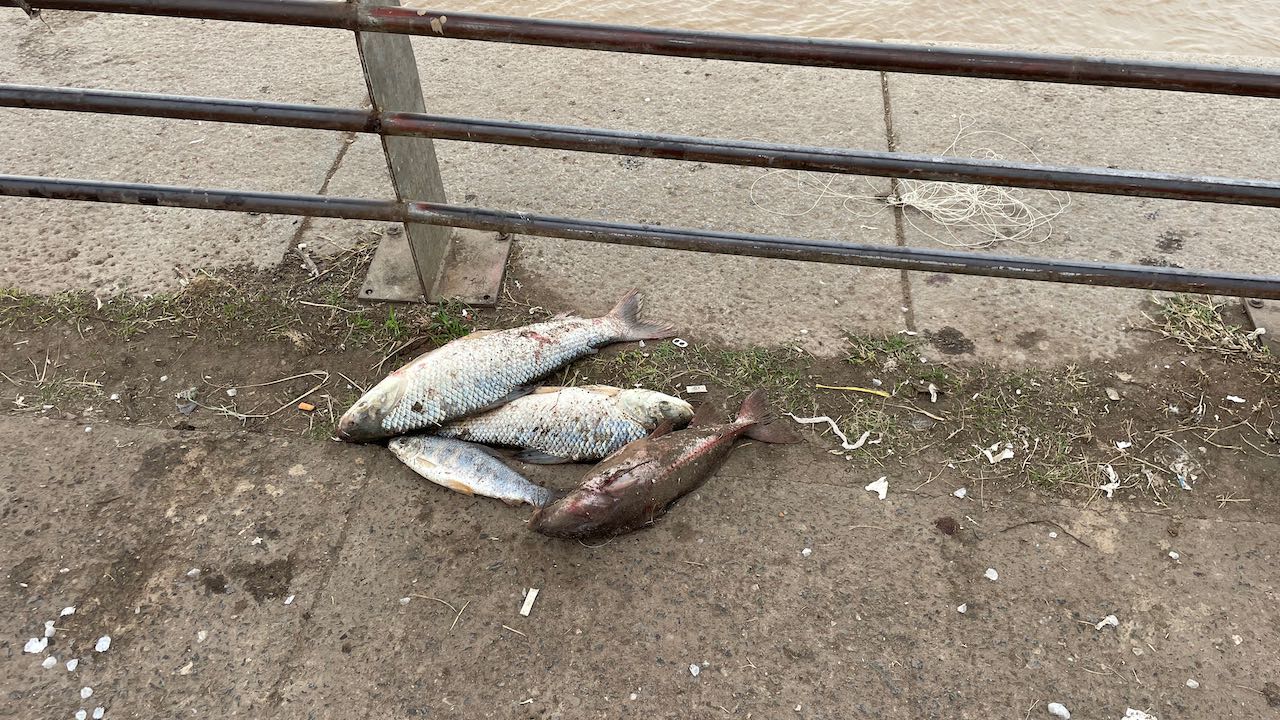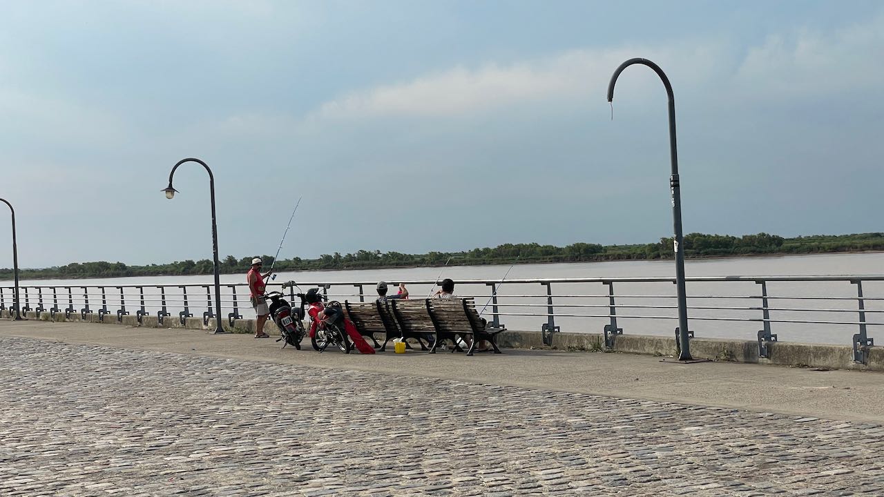 Der Fluss ist hier ca 500 Meter breit. Viele Angler versuchen ihr Glück, direkt neben dem Angeln-verboten-Schild