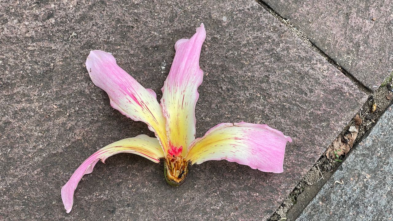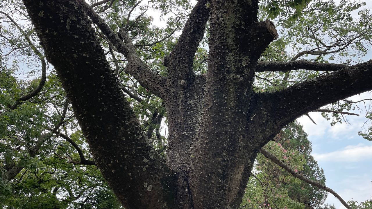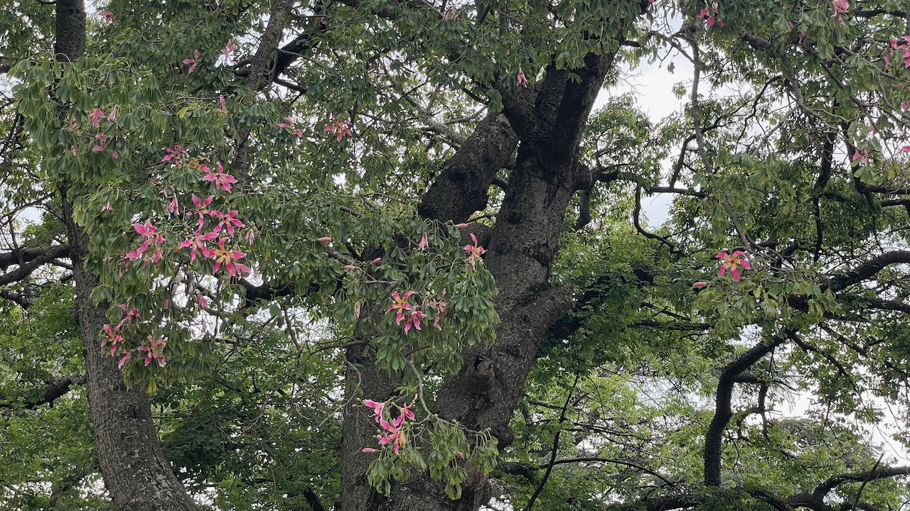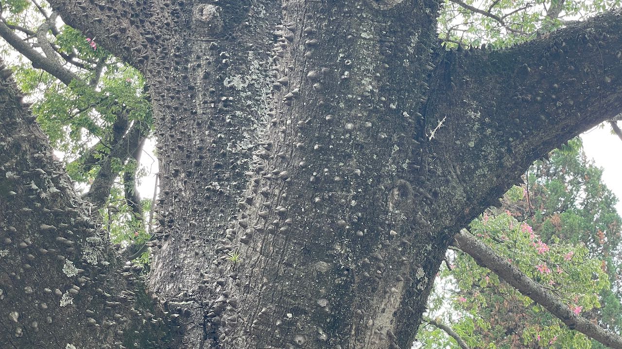 Zurück durch den Park, wir wandeln unter ausladenden Riesengummibäumen und stacheligen Florettseidenbäumen mit ihren wunderschönen Blüten