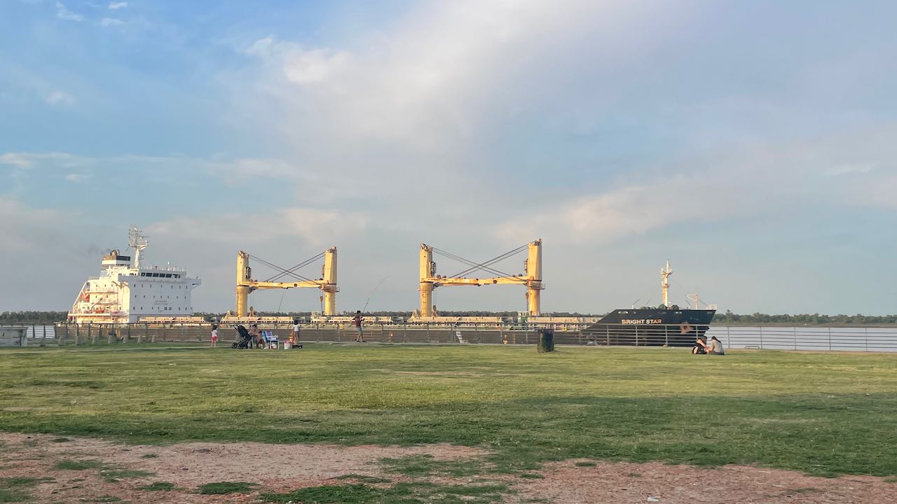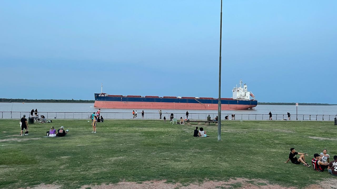 Riesige Schiffe schieben sich auf dem Fluß vorbei