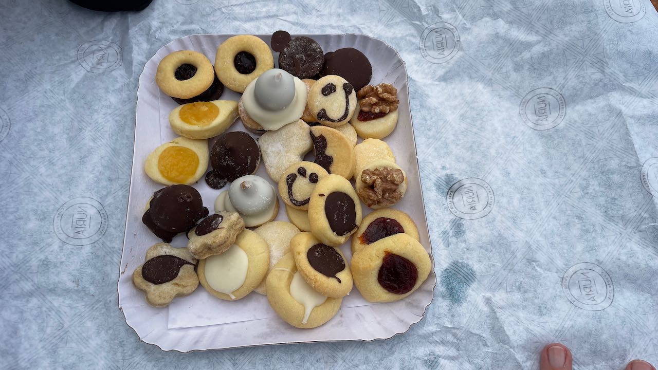 Wir probieren Käse und Alfajores – landestypische Kekse, er reißt die Verpackung mit den Zähnen auf….die Kekse sind uns viel zu süß.