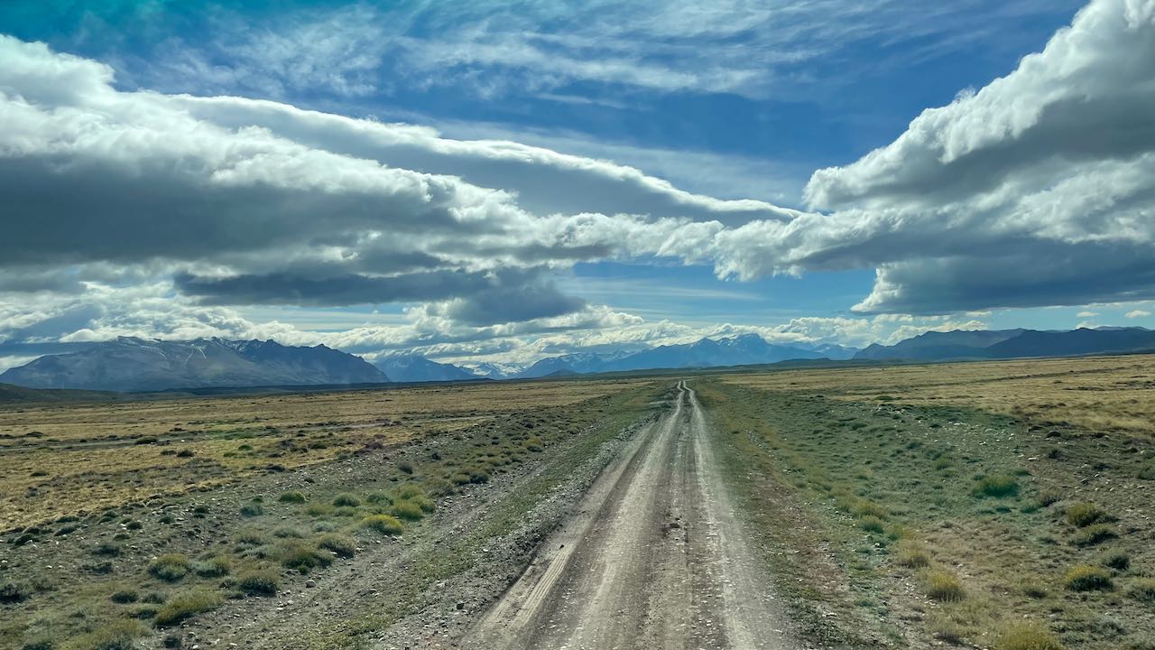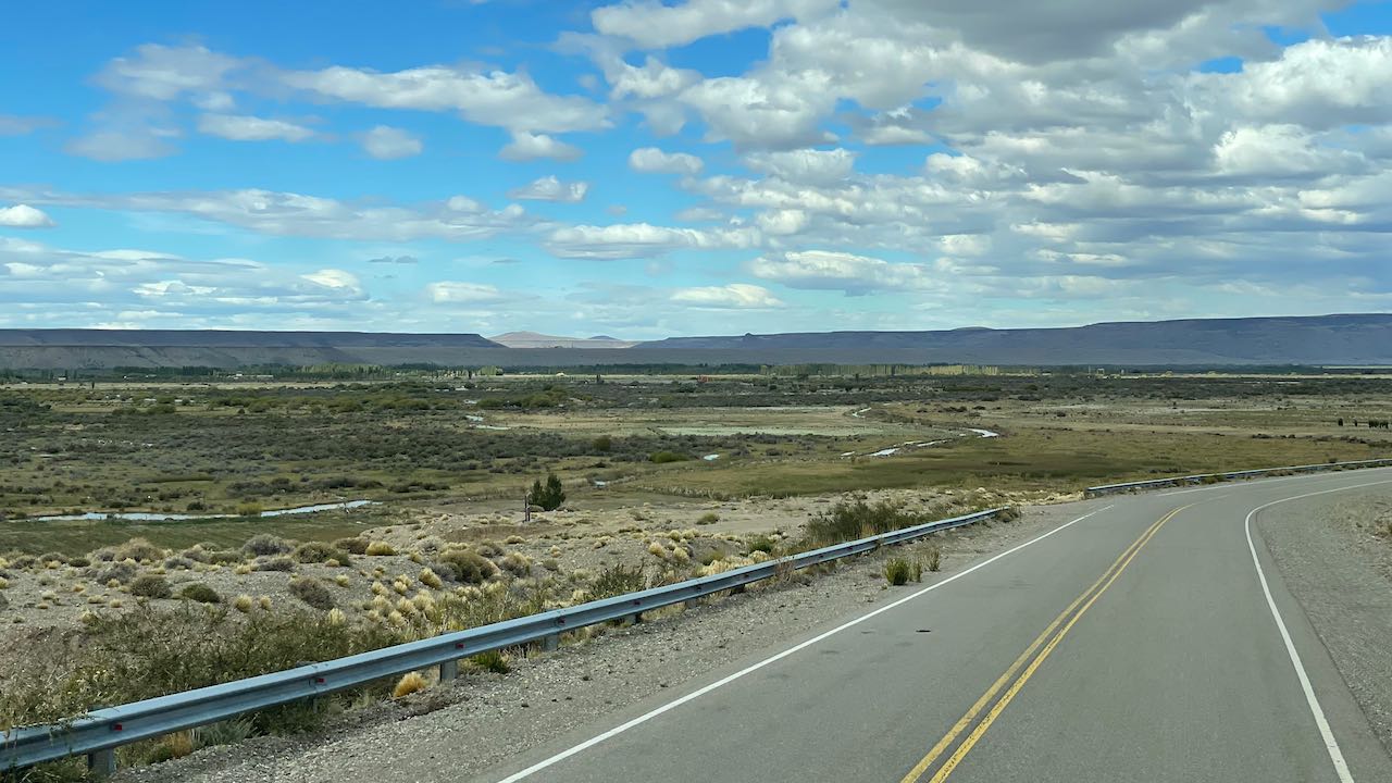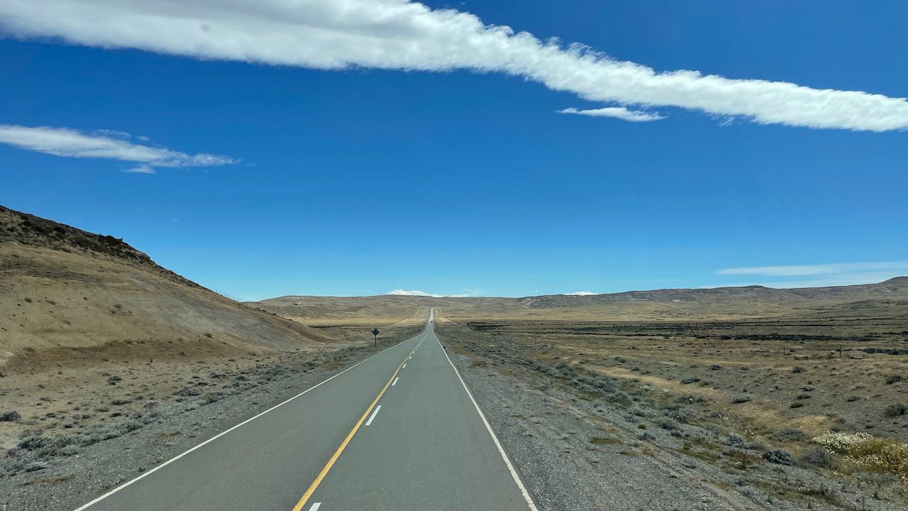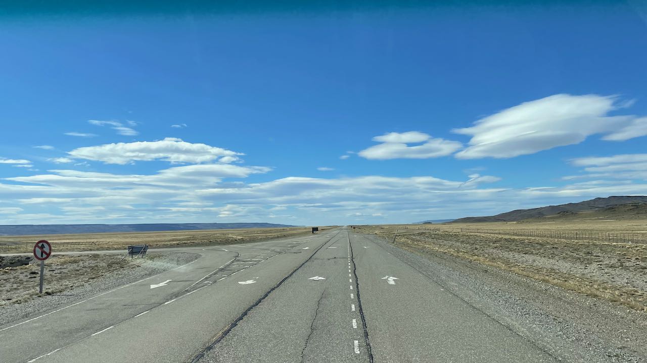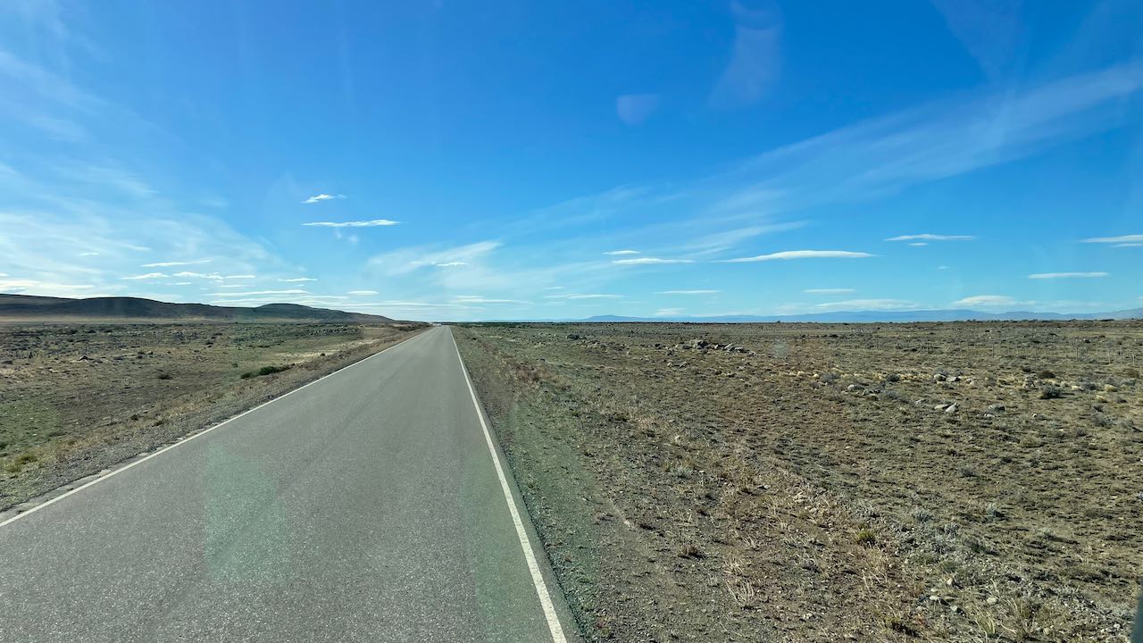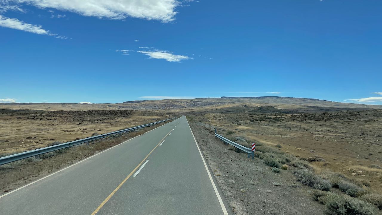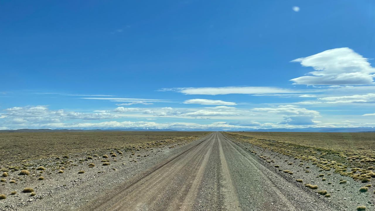 Braunschlammige Seen, von Flüssen durchzogene Wiesen, Pampa weit und windig, eine wie immer endlos wirkende Strasse