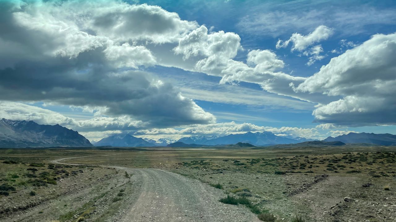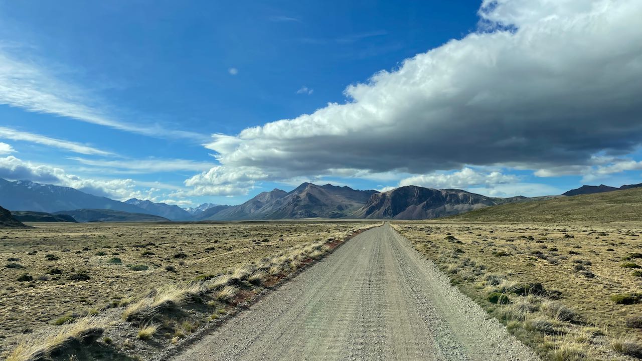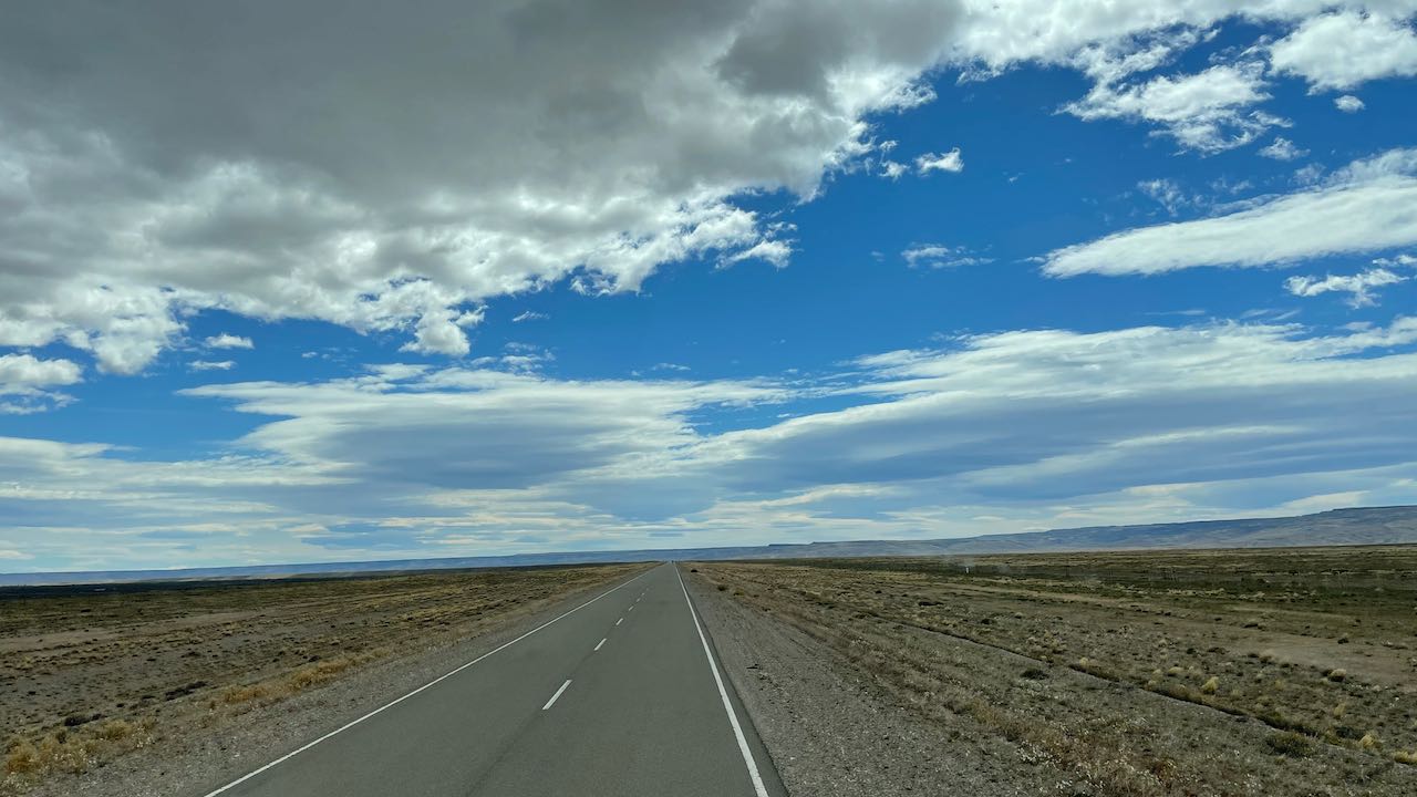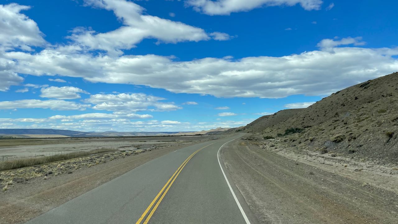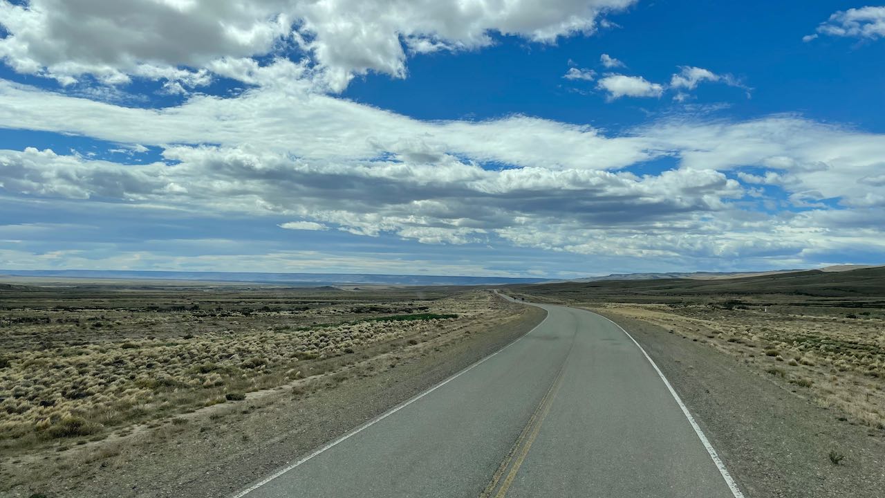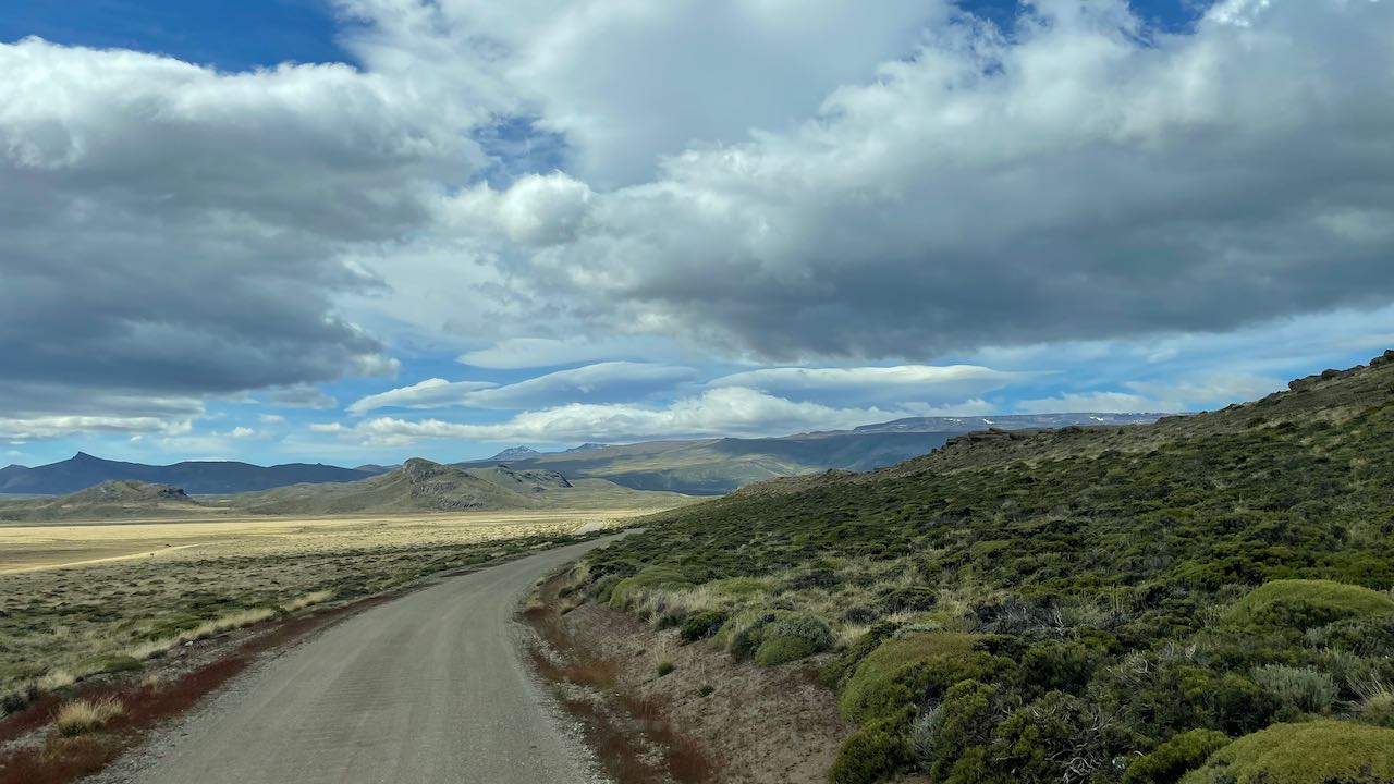 Braunschlammige Seen, von Flüssen durchzogene Wiesen, Pampa weit und windig, eine wie immer endlos wirkende Strasse