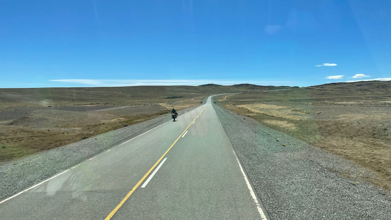 Unerbittlich fegt der Wind über die Pampa, der einsame Radfahrer lehnt sich tapfer dagegen