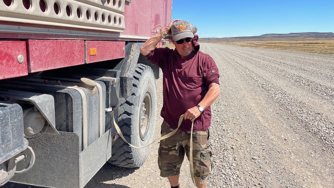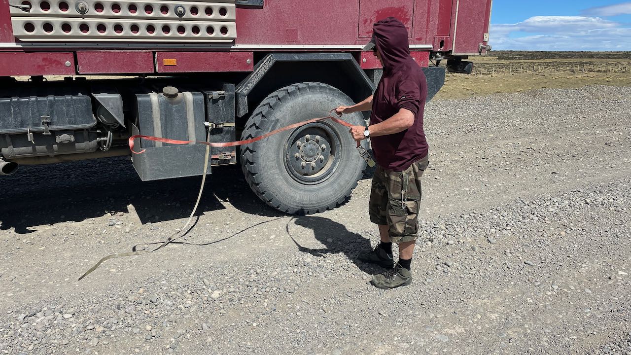 Spanngurte kann man nie genug dabei haben. Der Wind will mithelfen und lässt Martins Mütze und das Gurtband fliegen