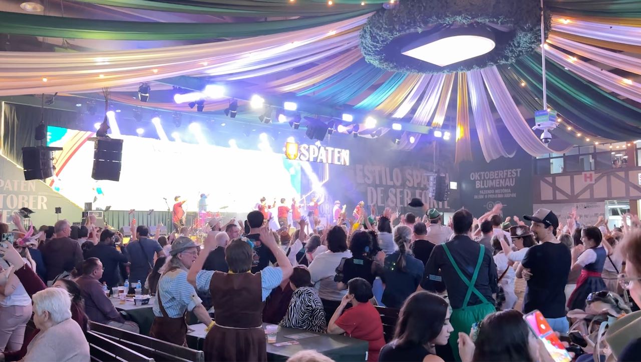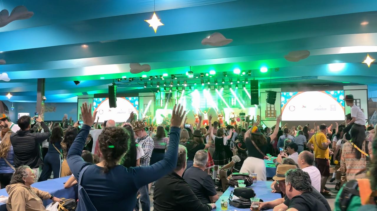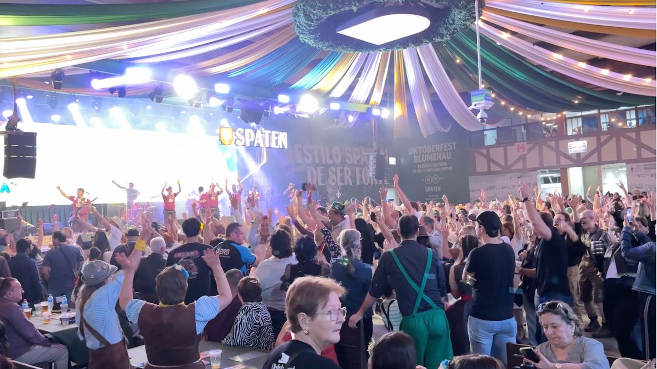 Aus den Boxen schallt eine Techno Version vom Blumenaulied „🎶das geht nach Blumenau….da ist der Himmel blau…🎶“