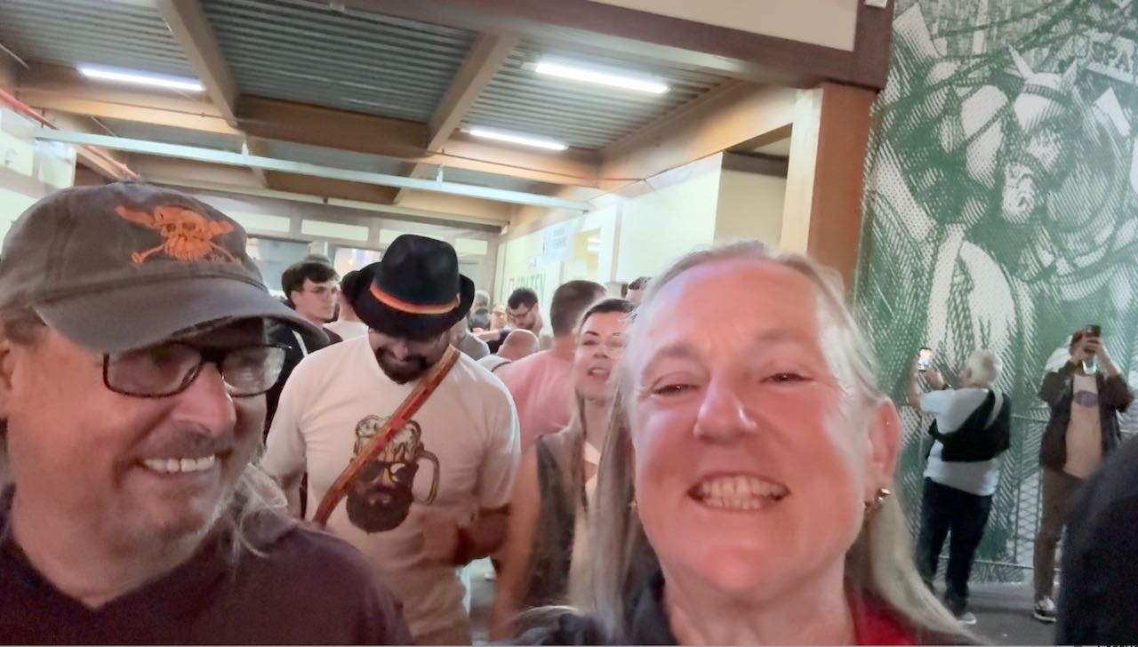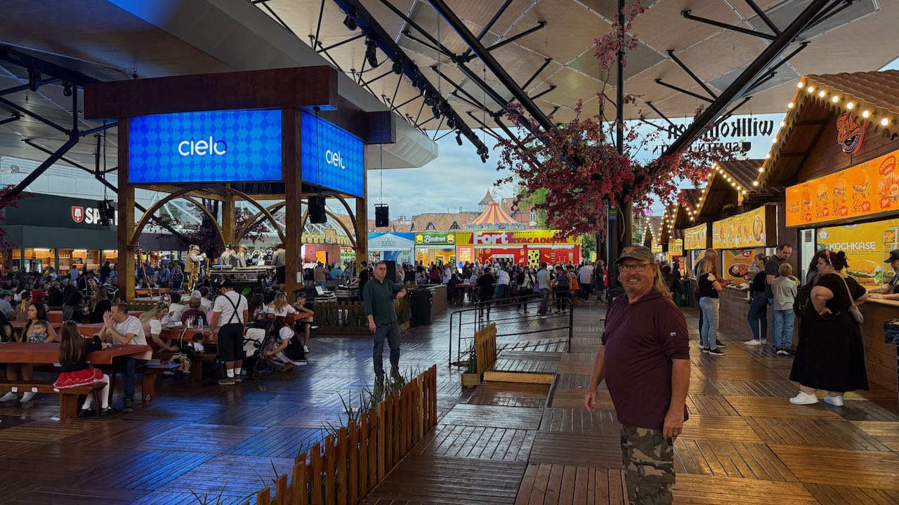Vom Food Truck nebenan holen sich die Leute überdimensional große Bockwürste, die aussehen wie aus Plastik. An den Tischen werden immense Mengen an Pommes serviert und riesige Fleischplatten. Alles in Übergröße. Die Leute feiern und haben Spaß, auf der Bühne spielt und singt ein Musiker, seit Stunden. Er hat schon gespielt, als wir mittags hier vorbeikamen.