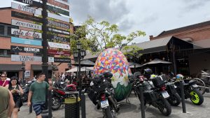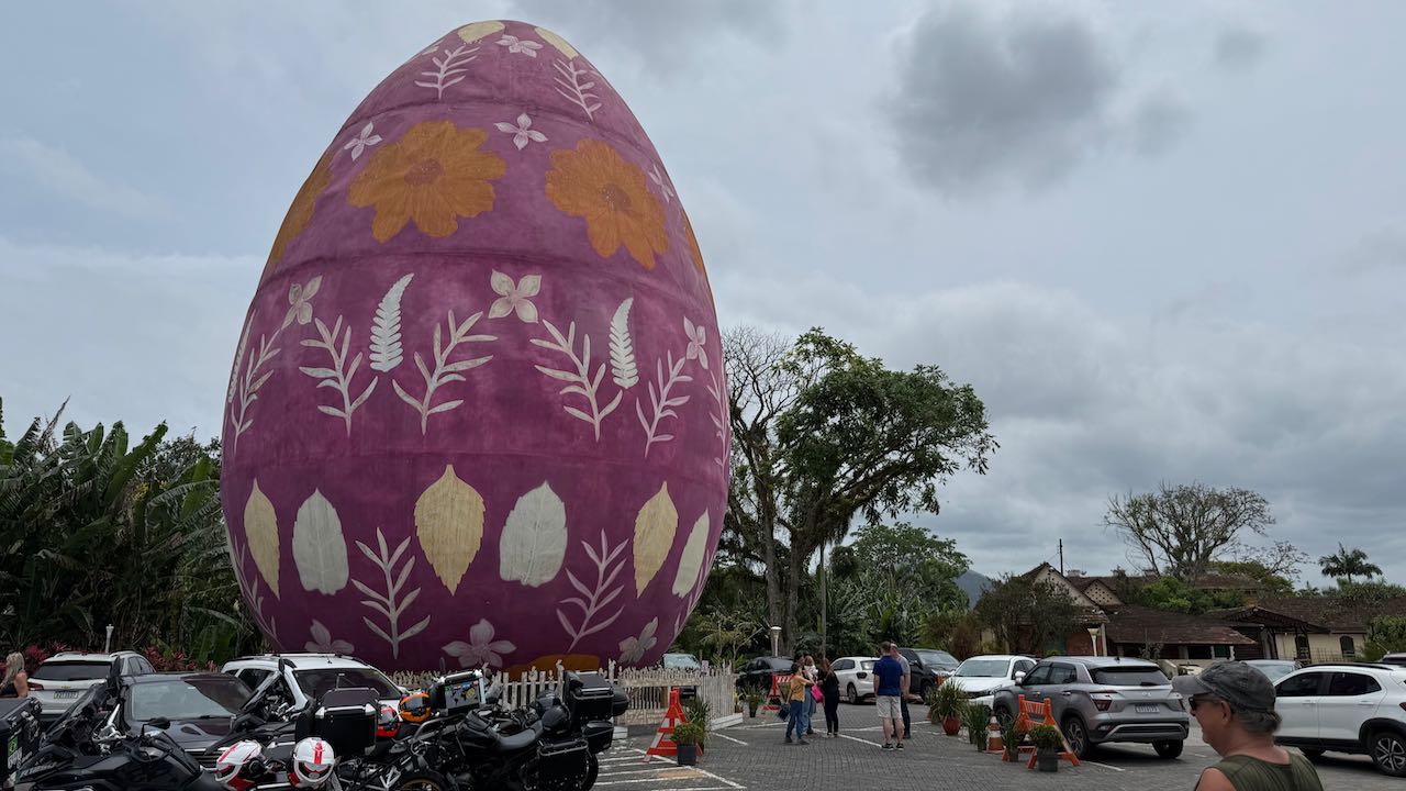 Ein riesiges Osterei steht auf dem Parkplatz, umgeben von einem niedlichen Hasenzaun.