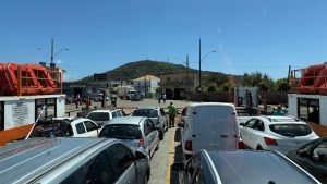 Vierzig Minuten müssen wir warten, dann ist die Fähre zurück und wir rollen an Bord