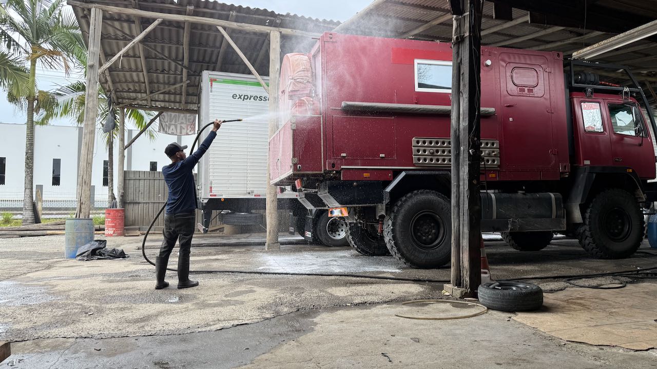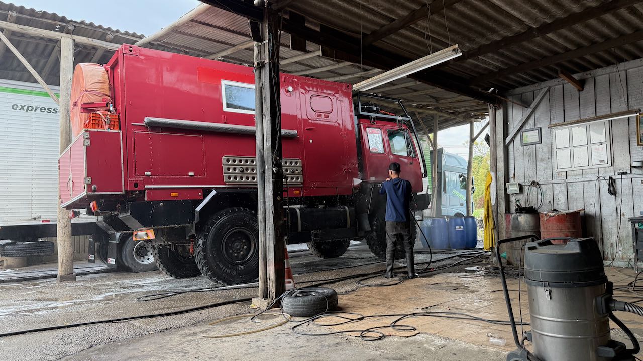 Ein bißchen Sucherei, dann finden wir eine Waschbude. Die Autowäscher sind sehr sehr schüchtern, zufällig ist nebenan gerade ein Kunde, der deutsch spricht und für uns übersetzt.