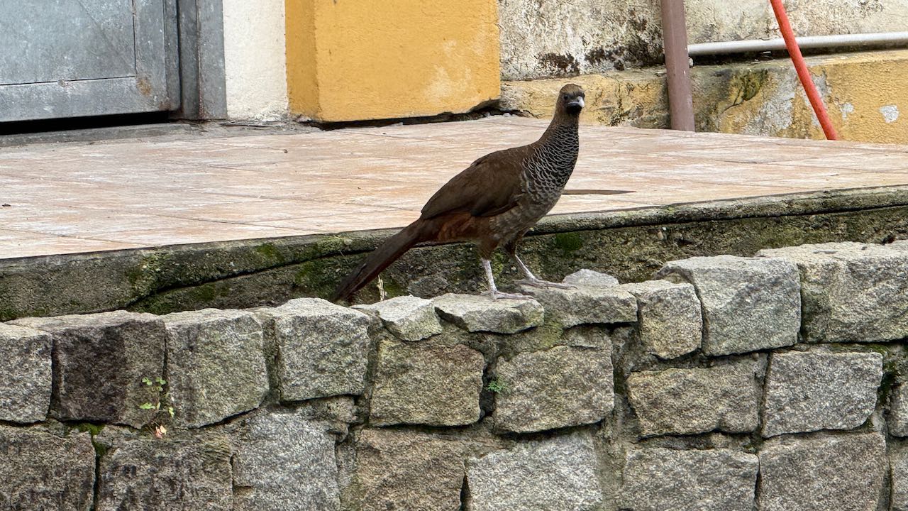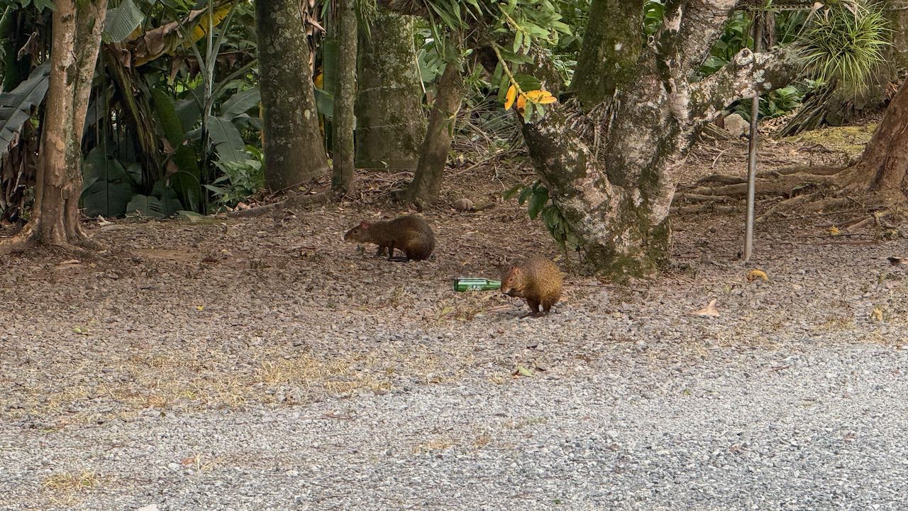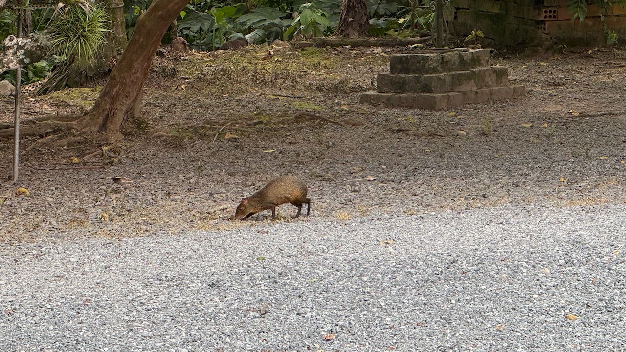 Ringsum wachsen hohe Bäume, Palmen, fremde Vogelstimmen, ein kleiner Dschungel. Acouchis trippeln herum und dieser etwas grimmig dreinblickende Vogel.