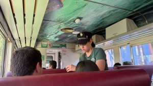 Unsere Waggonchefin begrüßt jeden Gast persönlich. Wir sind die einzigen, die nicht aus Südamerika kommen und werden sehr herzlich empfangen. Später werden draußen Fotos von jedem gemacht, der es möchte.
