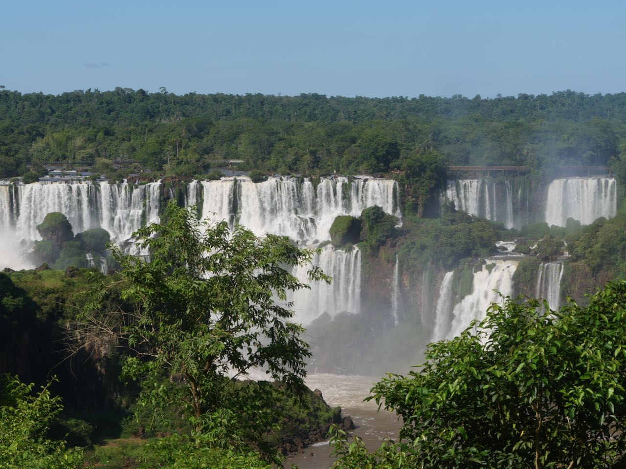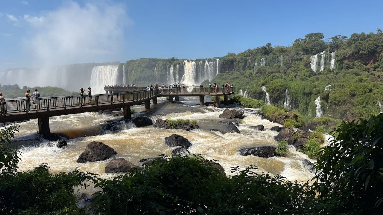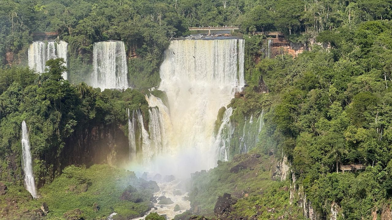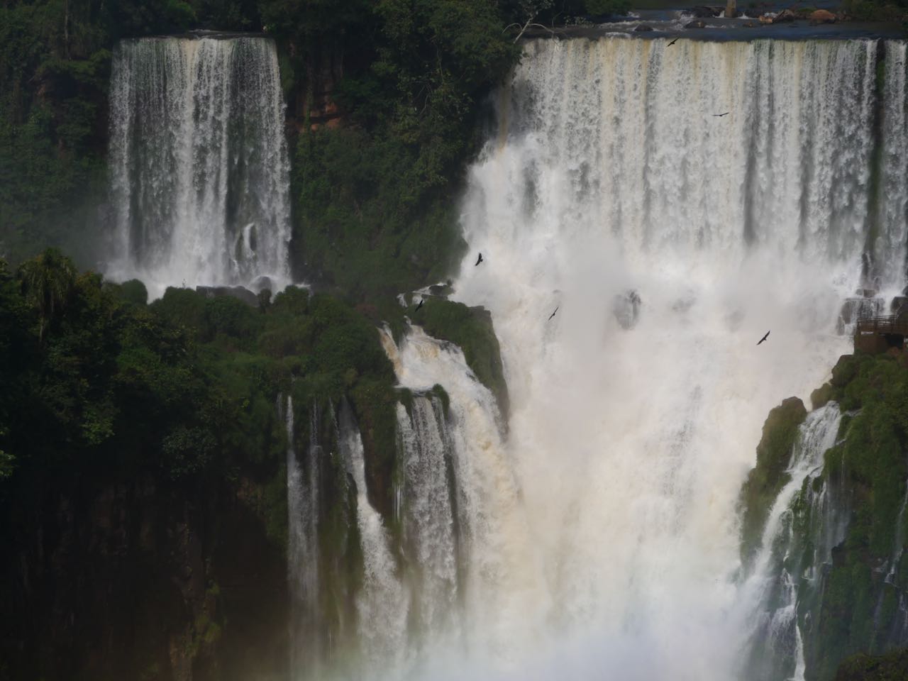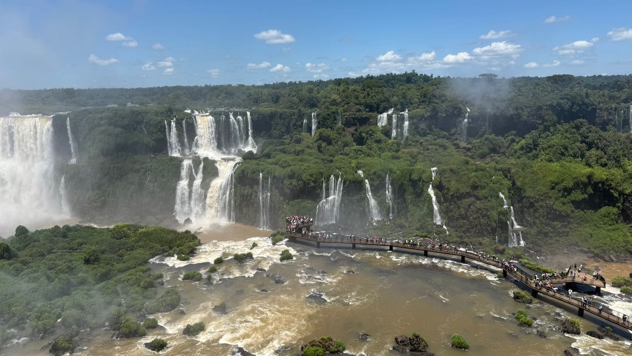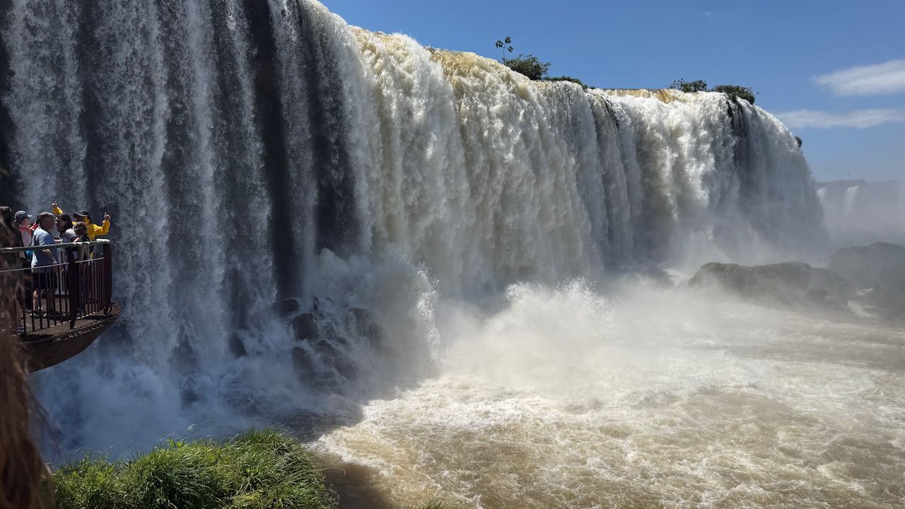 Wir schauen hinüber zur argentinischen Seite. Dort laufen die ersten Ausflügler über die Stege. Winzig klein im Vergleich zu den Wasserfällen.