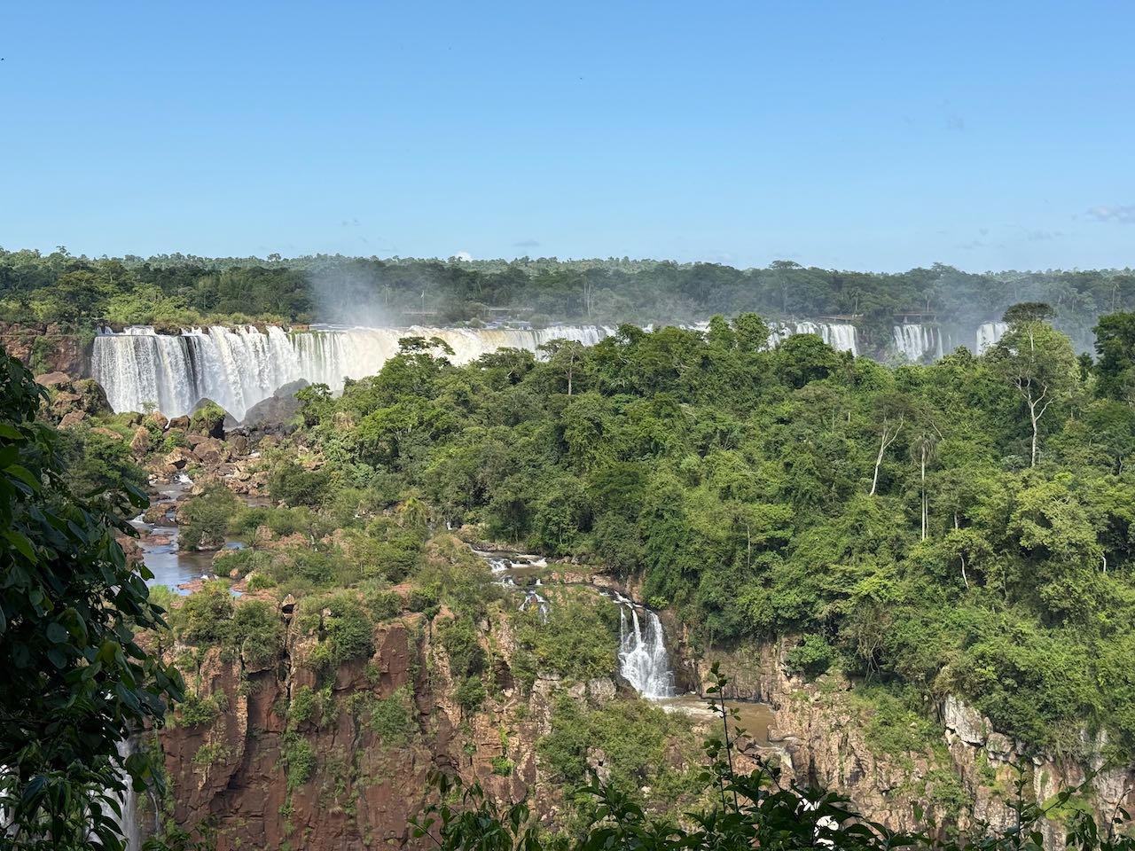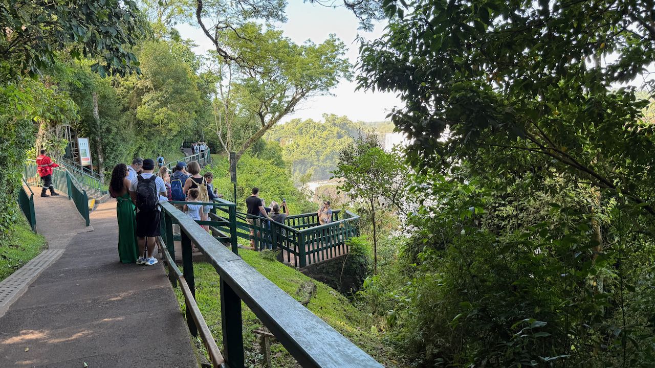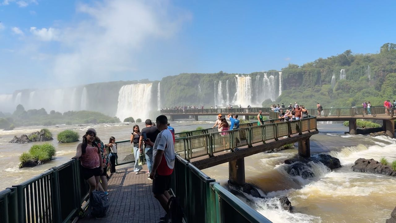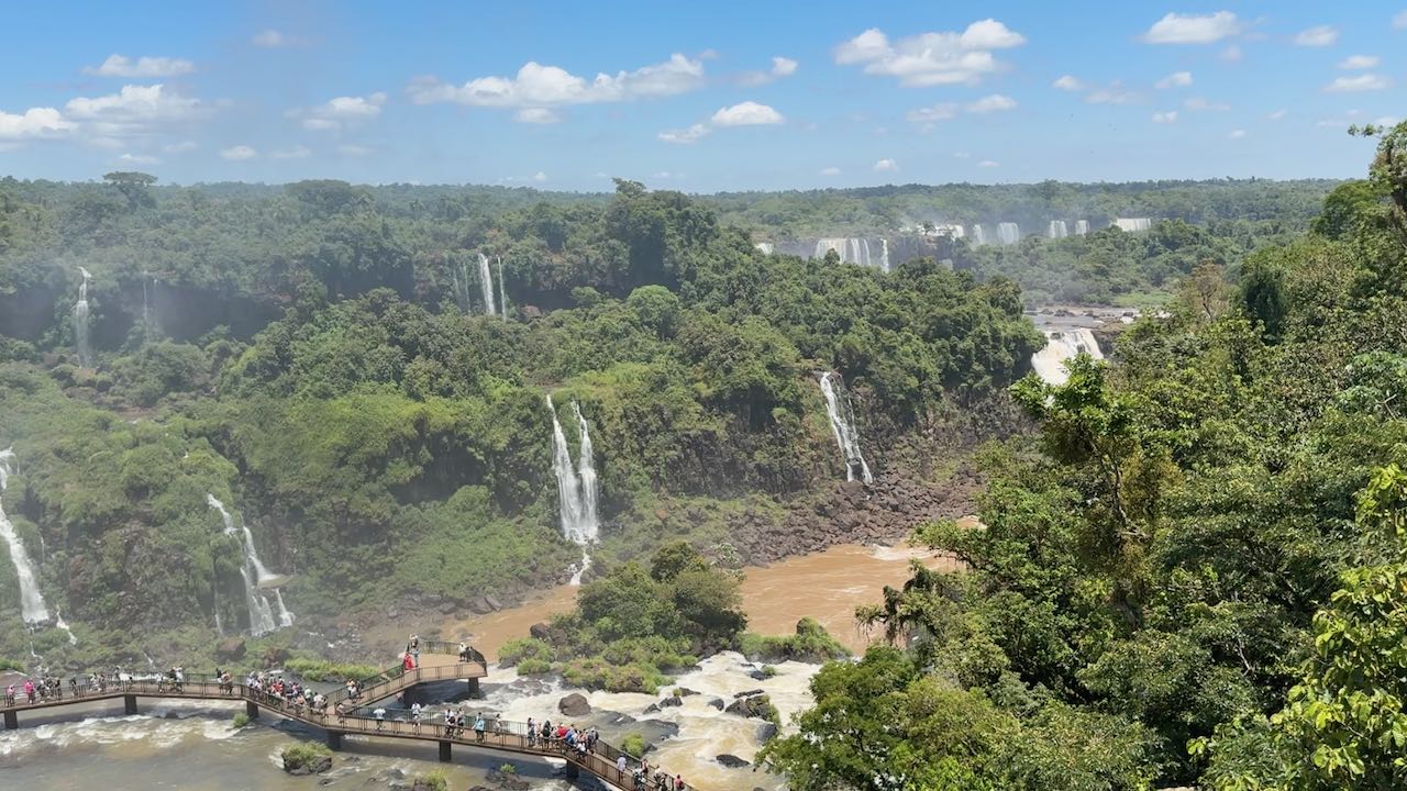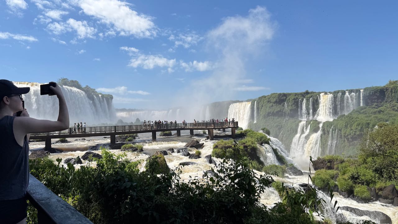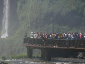 Wir schauen hinüber zur argentinischen Seite. Dort laufen die ersten Ausflügler über die Stege. Winzig klein im Vergleich zu den Wasserfällen.