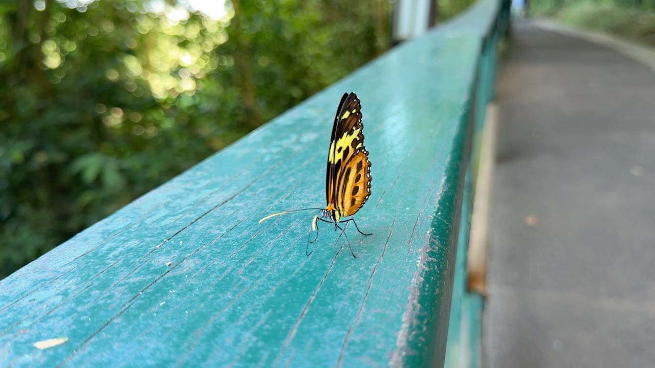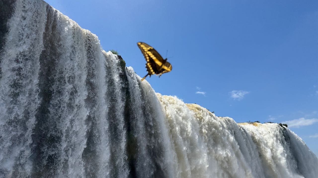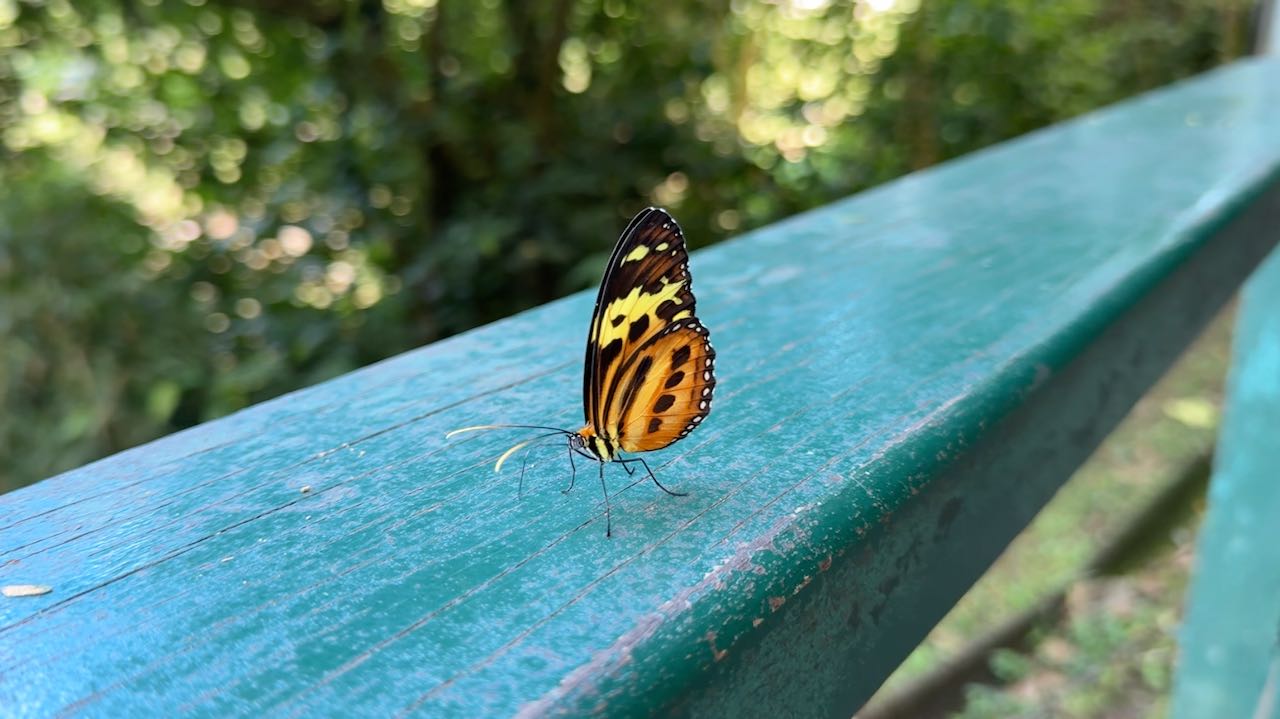 Um die 250 Schmetterlingsarten sollen in der Nähe der Wasserfälle leben. Wir werden regelrecht umschwärmt.