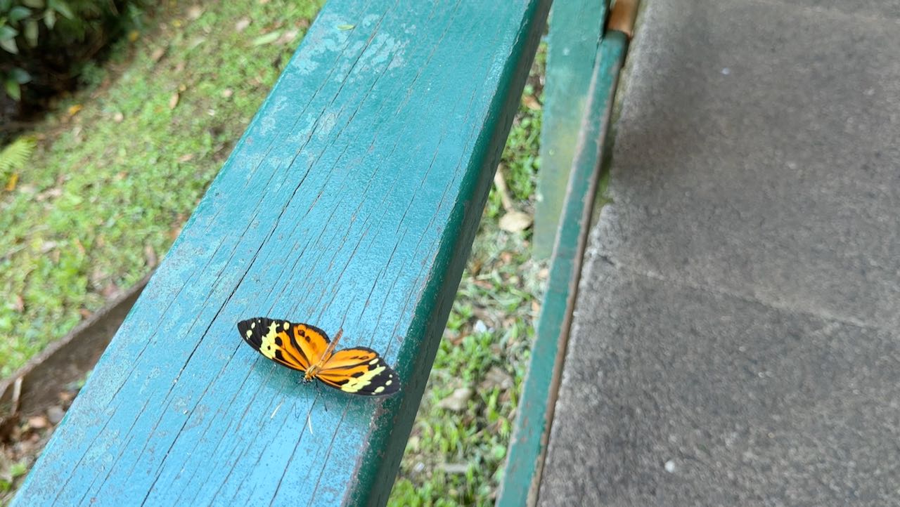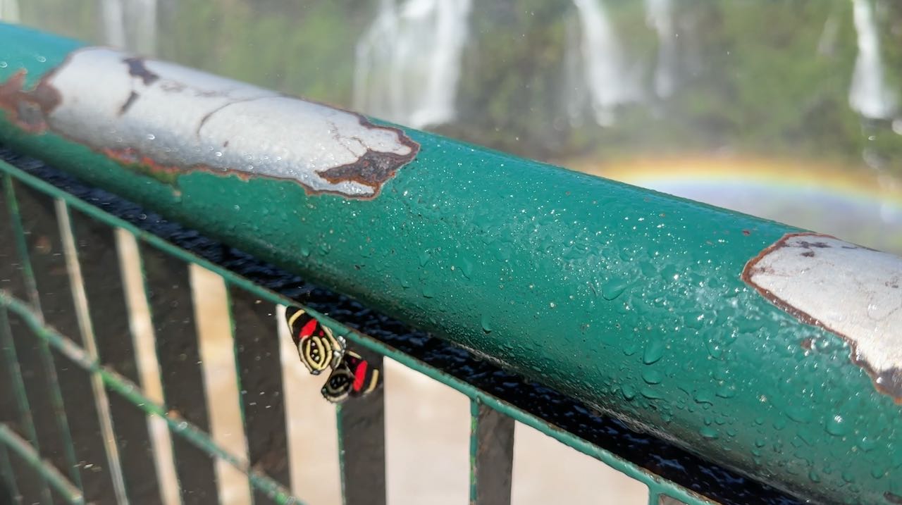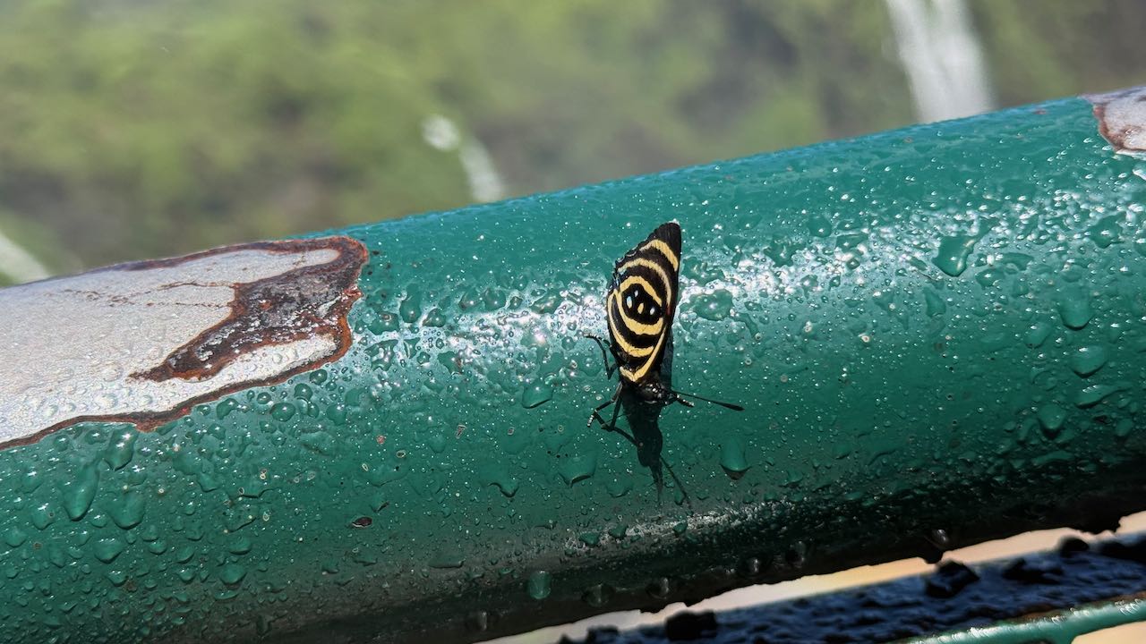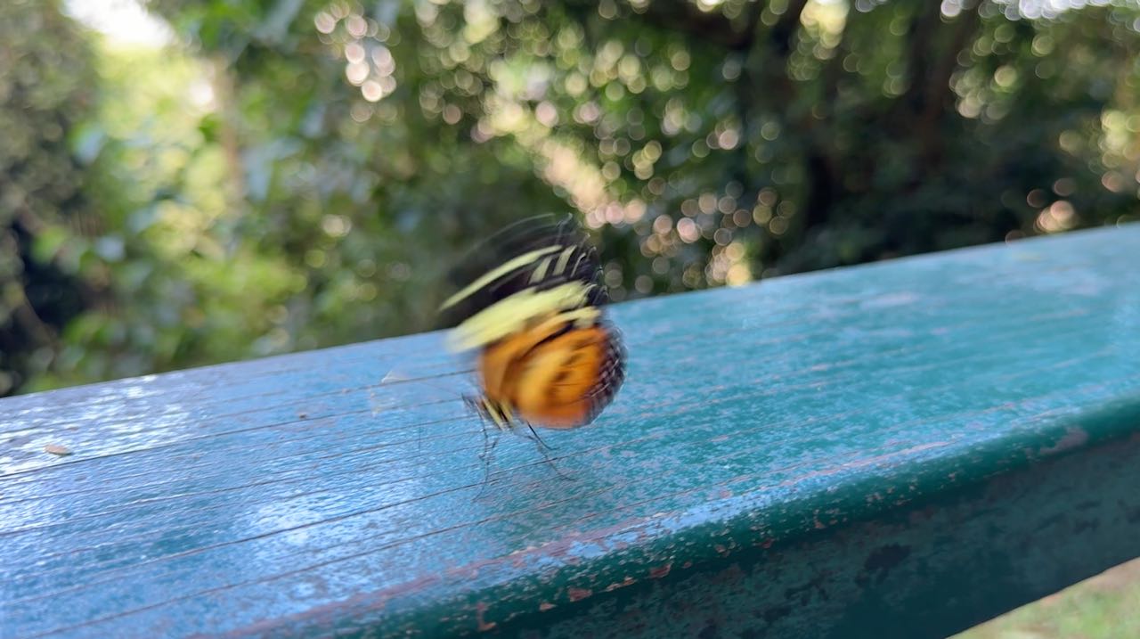 Um die 250 Schmetterlingsarten sollen in der Nähe der Wasserfälle leben. Wir werden regelrecht umschwärmt.