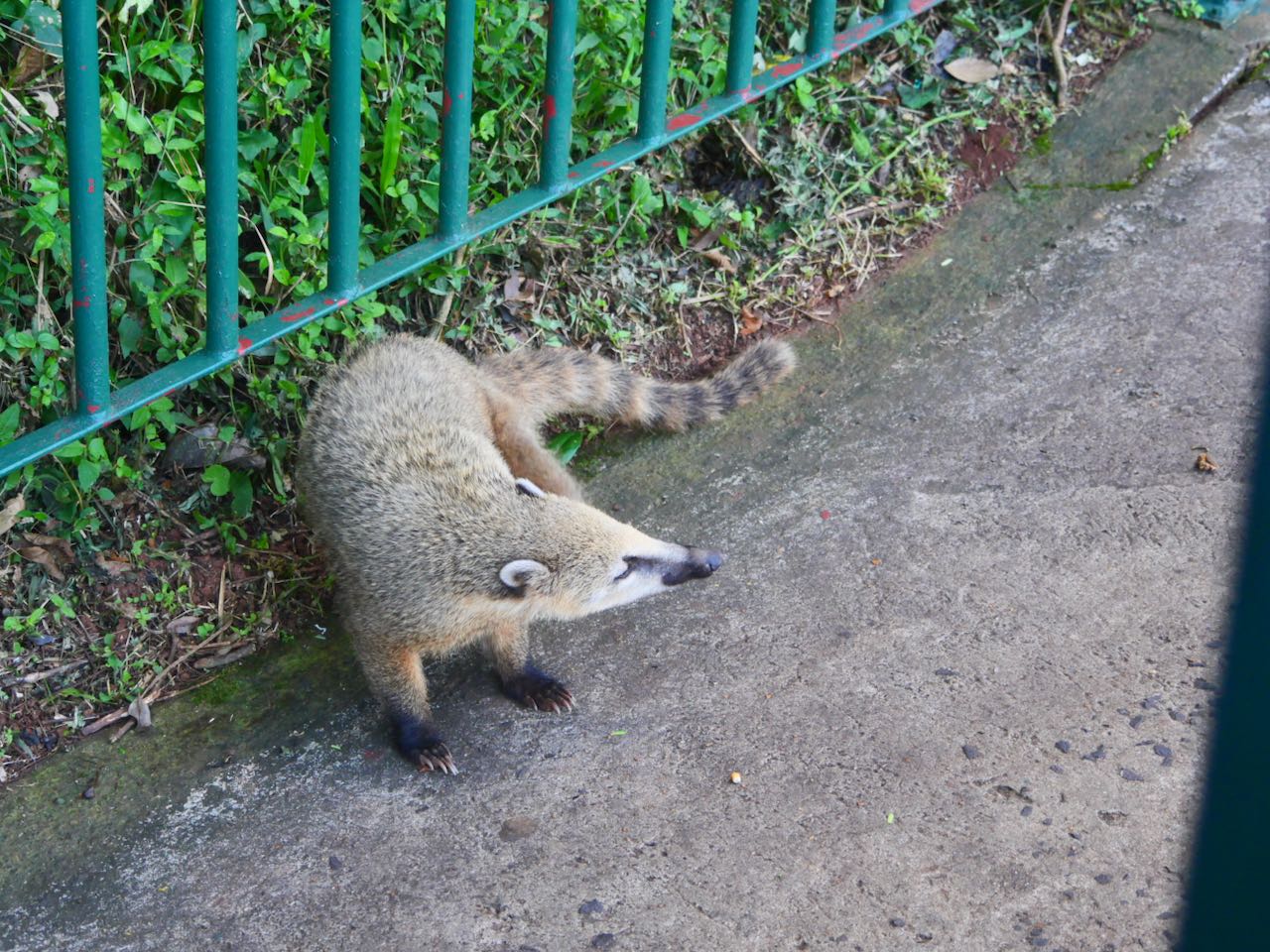 Nasenbären schnüffeln herum. Leider mißachten viele Leute das Fütterverbot und locken mit Pommes und Keksen. Dabei wird eindringlich gewarnt, denn die süßen Bärchen beißen auch gerne mal in die Hand, die sie füttert.