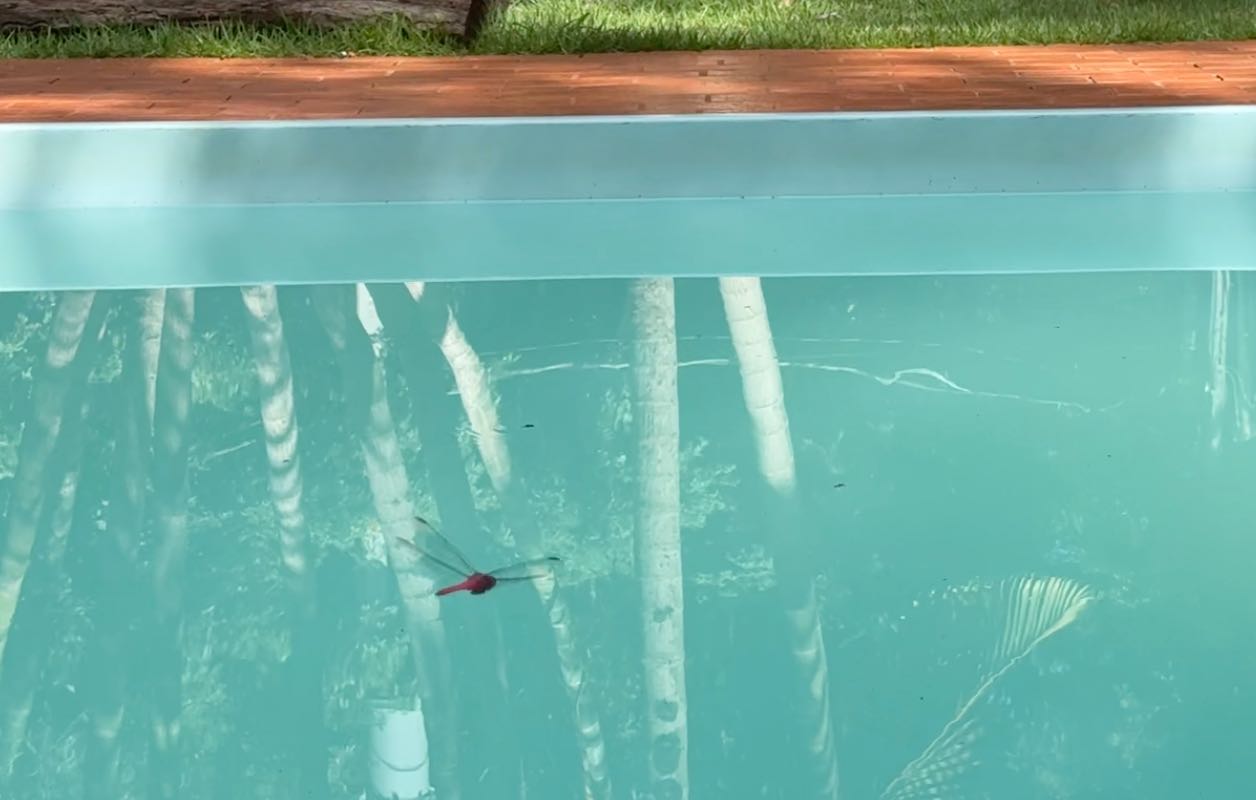 Goldgelbe Falter werfen ihre Schatten auf das türkise Wasser, rote Riesenlibellen schwirren hin und her.