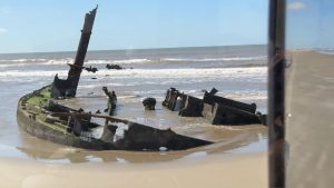 Ein Wrack fängt unsere Aufmerksamkeit, wir übersehen eine Bodenwelle und krachen voll durch……wow, das scheppert….