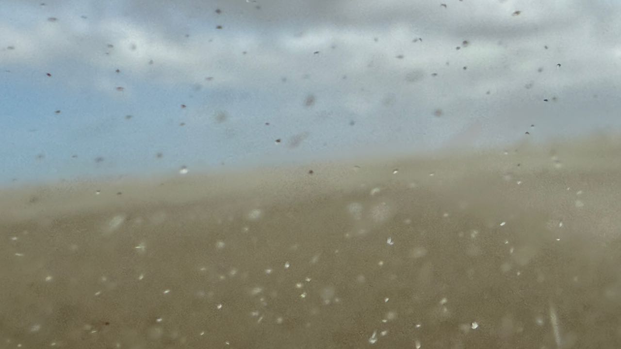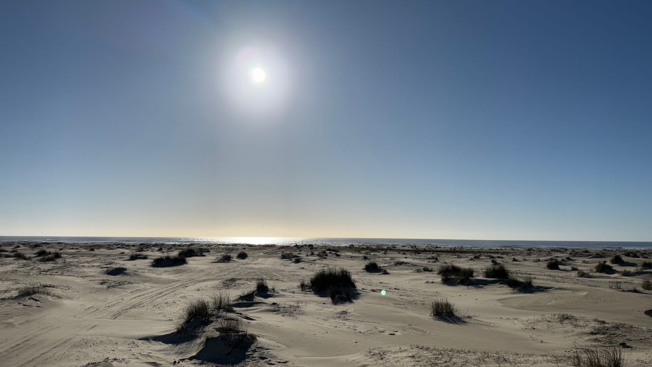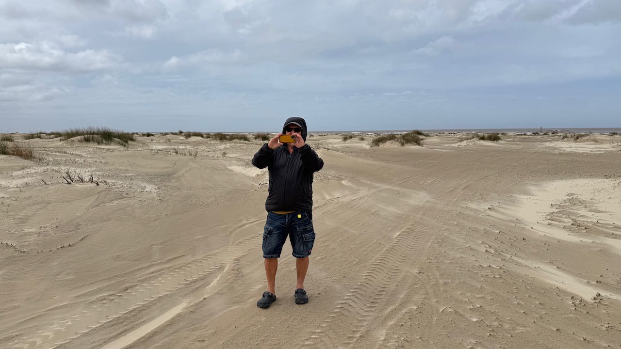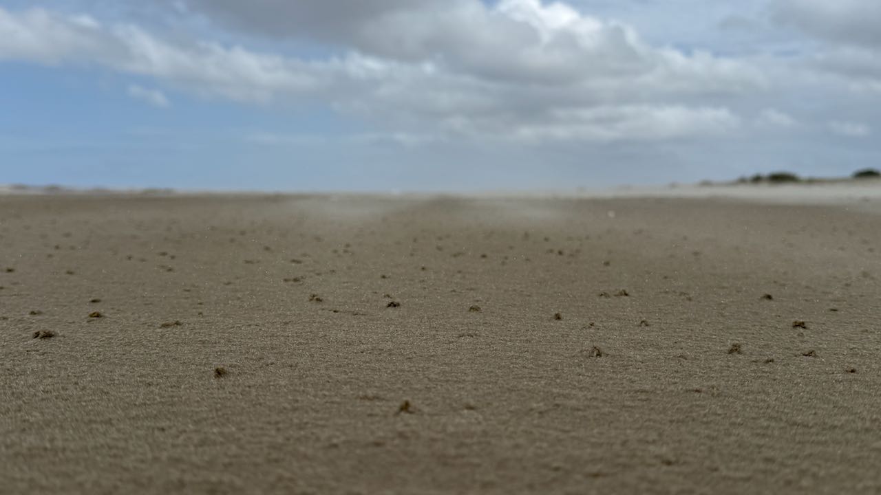 Sandschleier wehen uns entgegen, getrieben von kräftigem Wind.