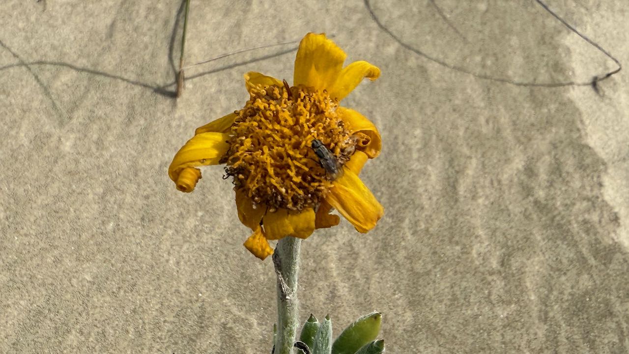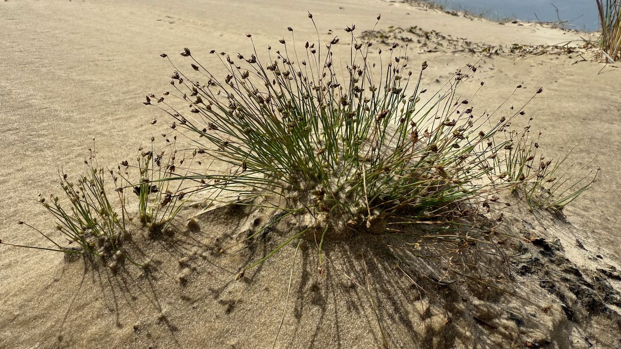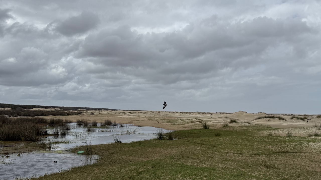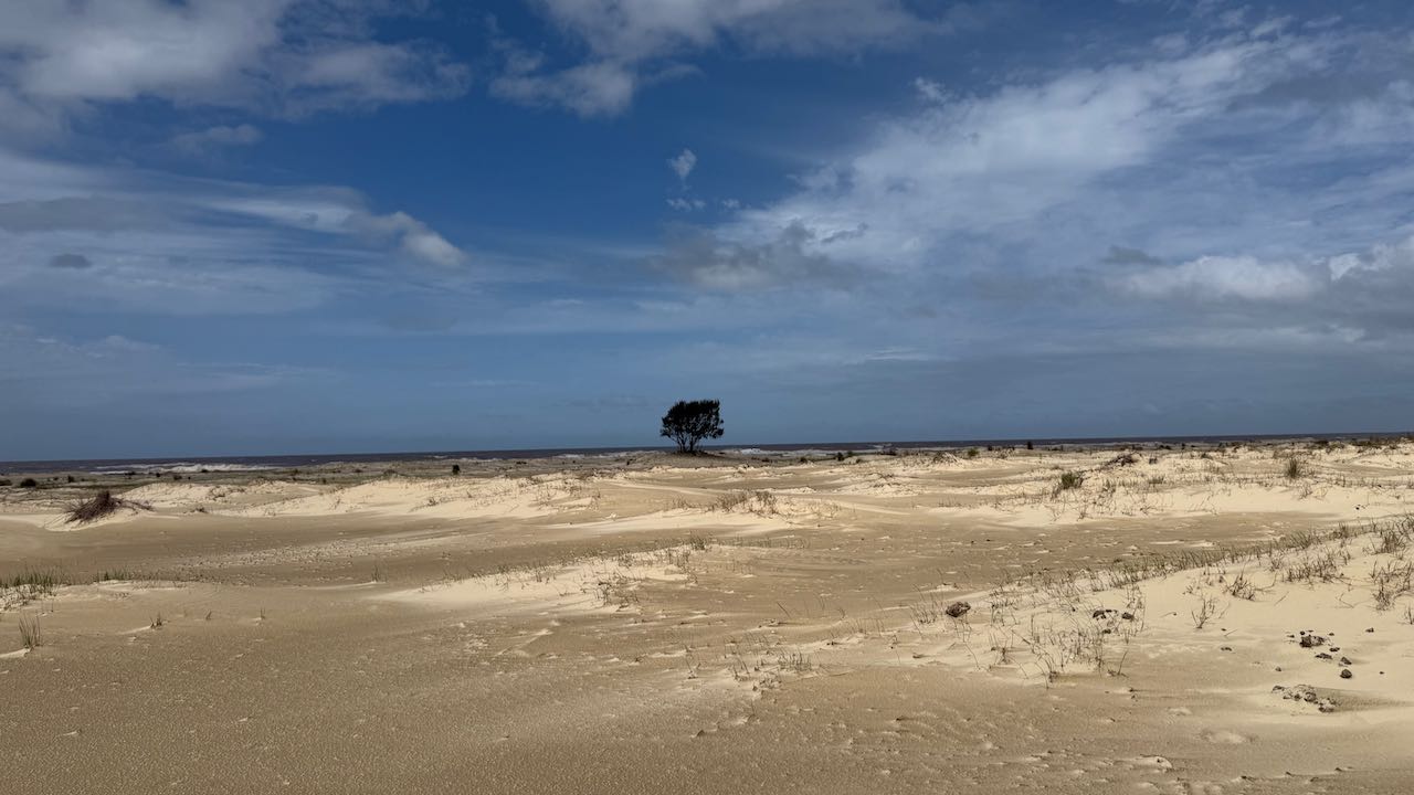 Sandschleier wehen uns entgegen, getrieben von kräftigem Wind.