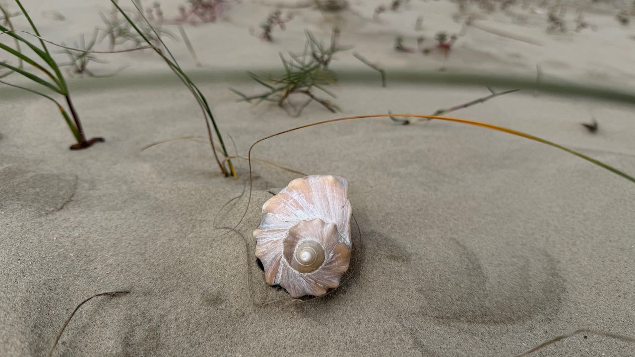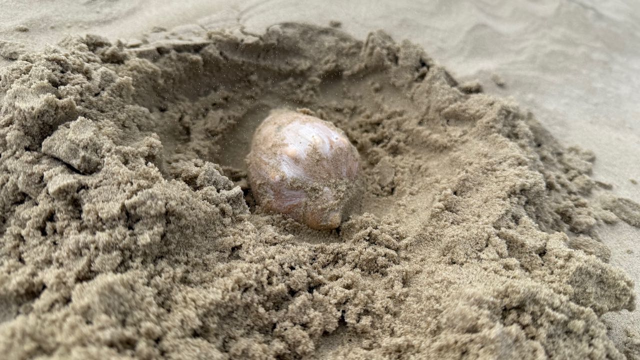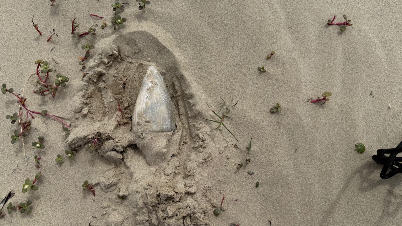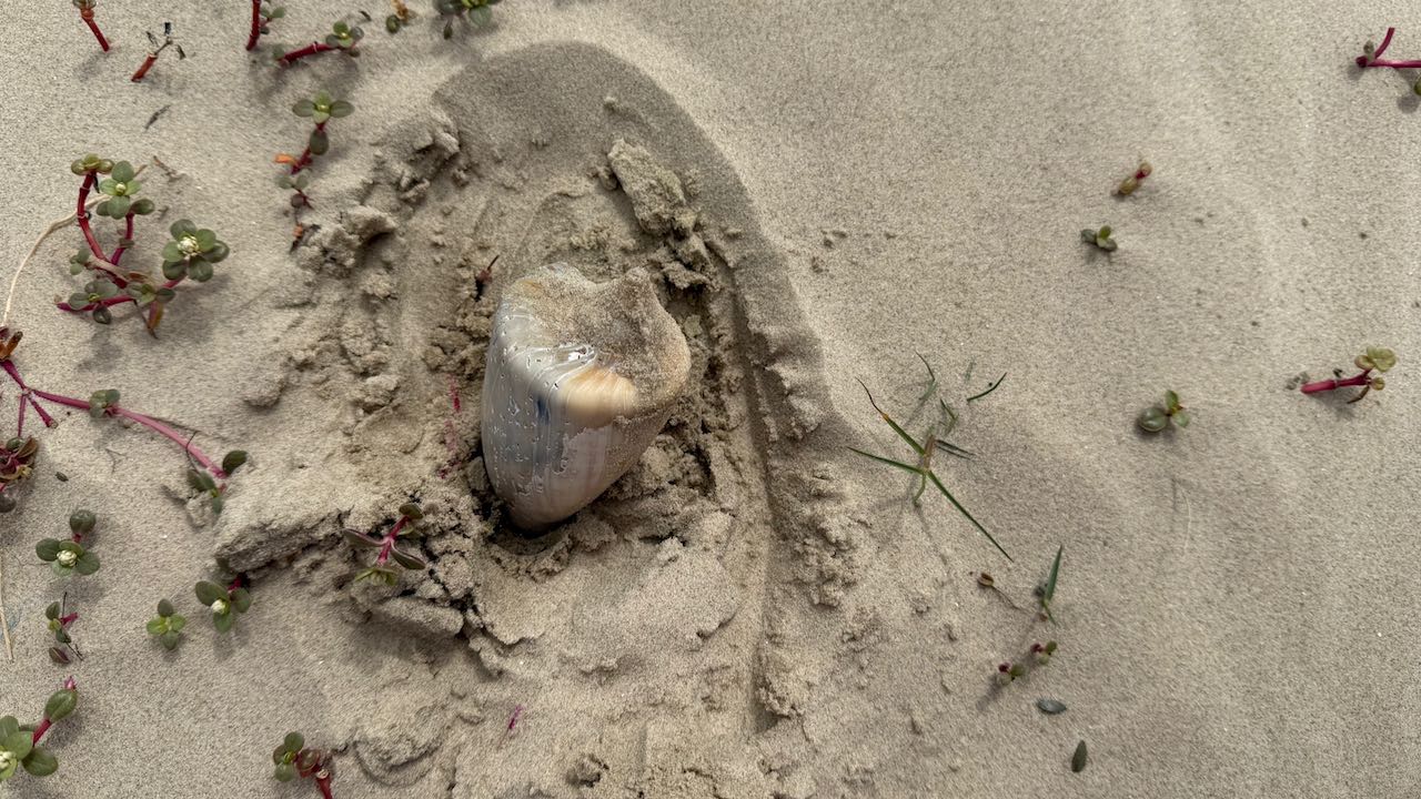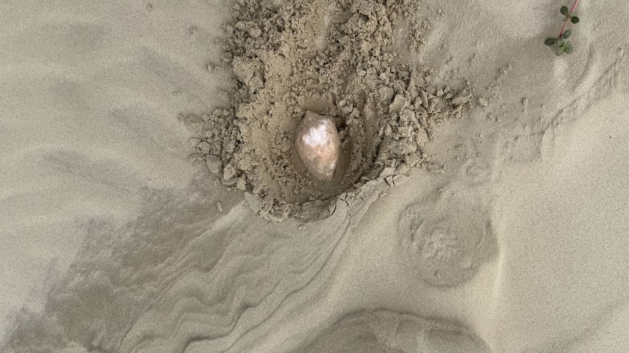 Manchmal sieht man nur ein winziges Stückchen vom Gehäuse im Sand. Ein bißchen graben…..