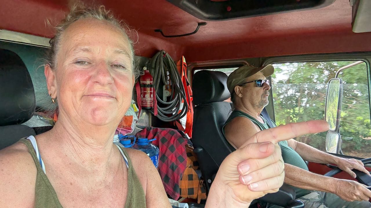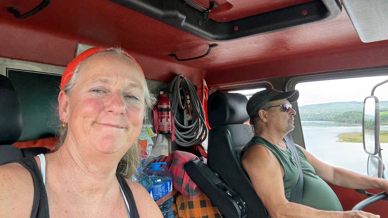 Eben noch allein werden wir jetzt schön eingerahmt von zwei langen Lastern, daneben wirkt Rappelkiste fast winzig.