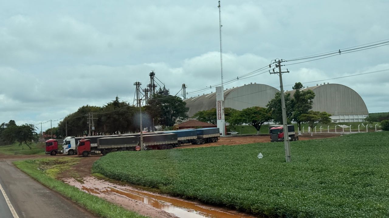 Vor den Silotürmen warten endlose Reihen von Lastern